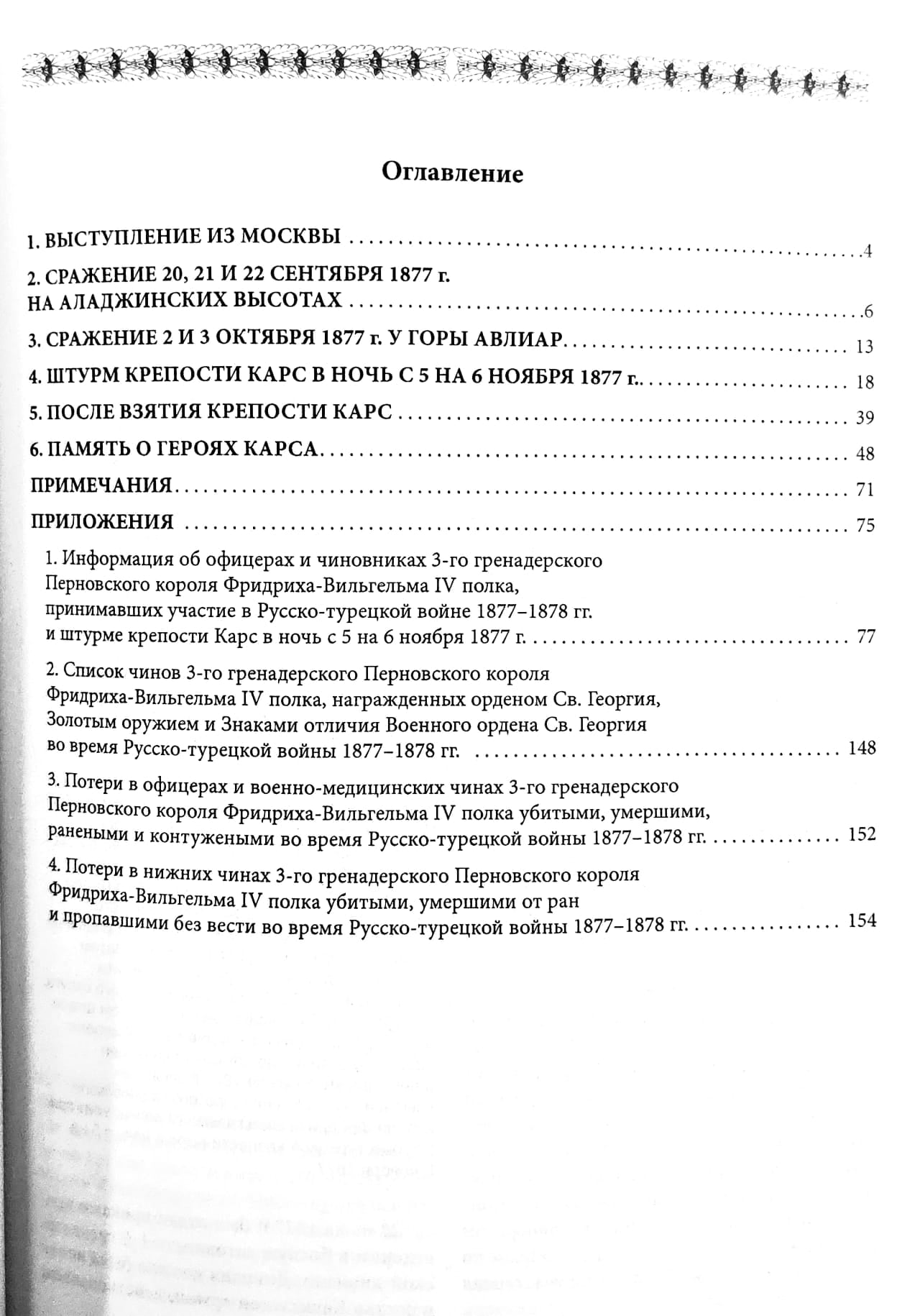 Книга посвящена компании 3-го гренадерского Перновского короля Фридриха-Вильгельма IV полка на Азиатском театре военных действий во время Русско-турецкой войны 1877–1878 гг. и судьбам всех офицеров, чиновников и нижних чинов, служивших в полку в этот период. В турецкой компании перновцы поддержали боевую славу гренадер, проявили подвиги безграничного мужества, храбрости и отваги, чем заслужили Георгиевские серебряные трубы и знамена с надписью «За взятiе Карса 6 ноября 1877 г.».