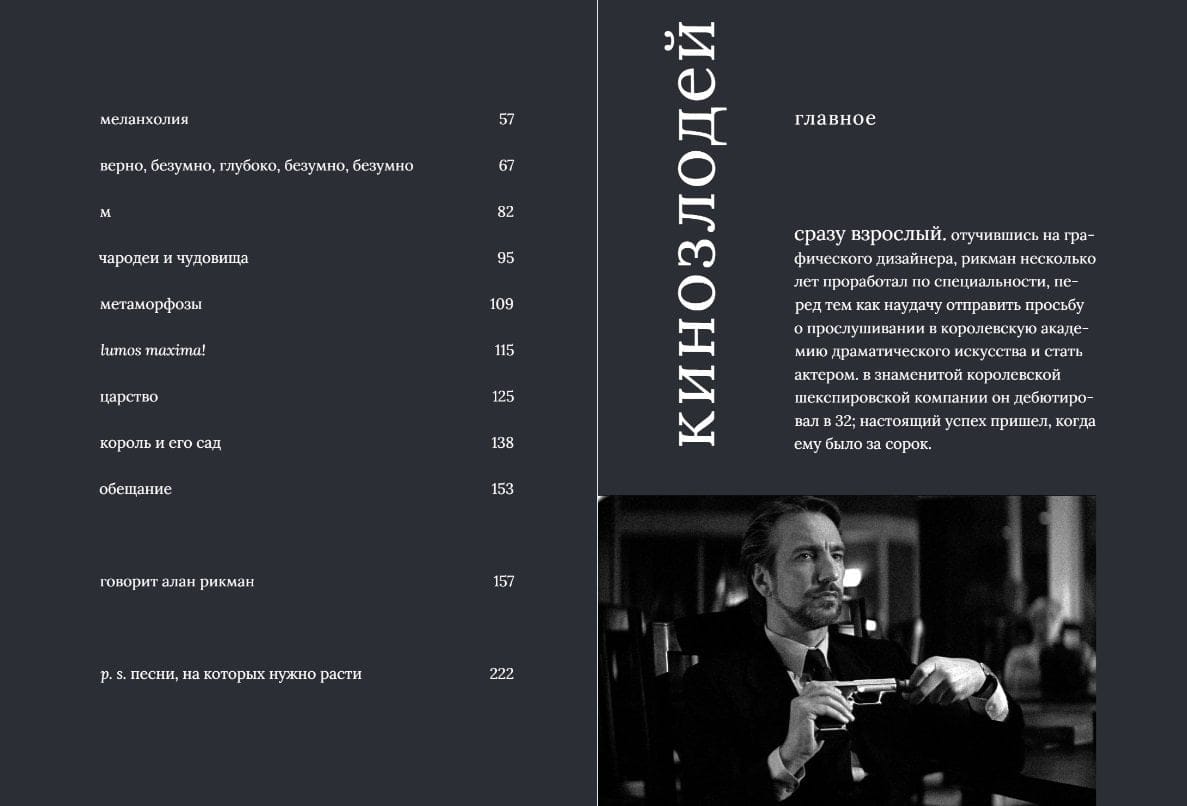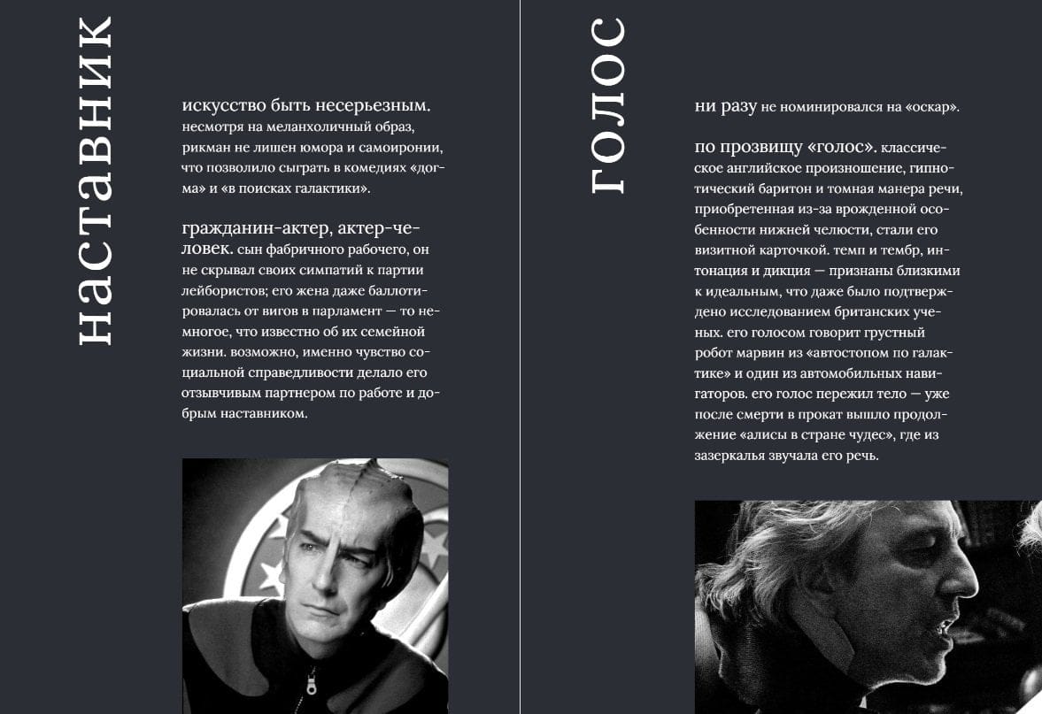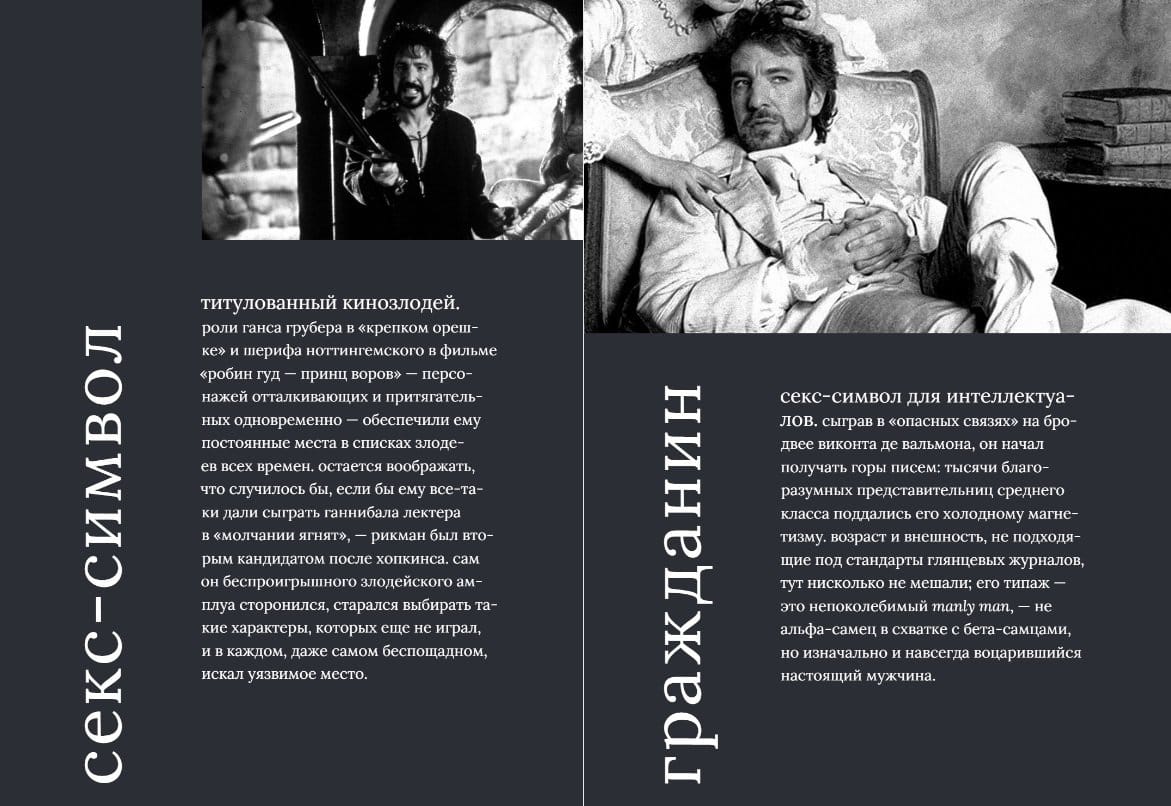 В 26 лет у Рикмана уже было высшее образование и даже своя дизайн-студия. Однако душа рвалась на сцену. Поэтому он бросил налаженную жизнь и в 1972 году поступил в Королевскую академию драматического искусства. Тогда все встало на свои места. С тех пор Рикман сыграл сотни ролей в театре и кино. Он был Виконтом де Вальмоном, злодеем-немцем в «Крепком орешке», злобным шерифом Ноттингемом, Григорием Распутиным и ангелом Метатроном. И это только часть многогранного калейдоскопа ролей артиста. В 2016 году Алана Рикмана не стало. Это стало оглушающей трагедией для множества его поклонников по всему миру. Но память о нем навсегда останется с нами.