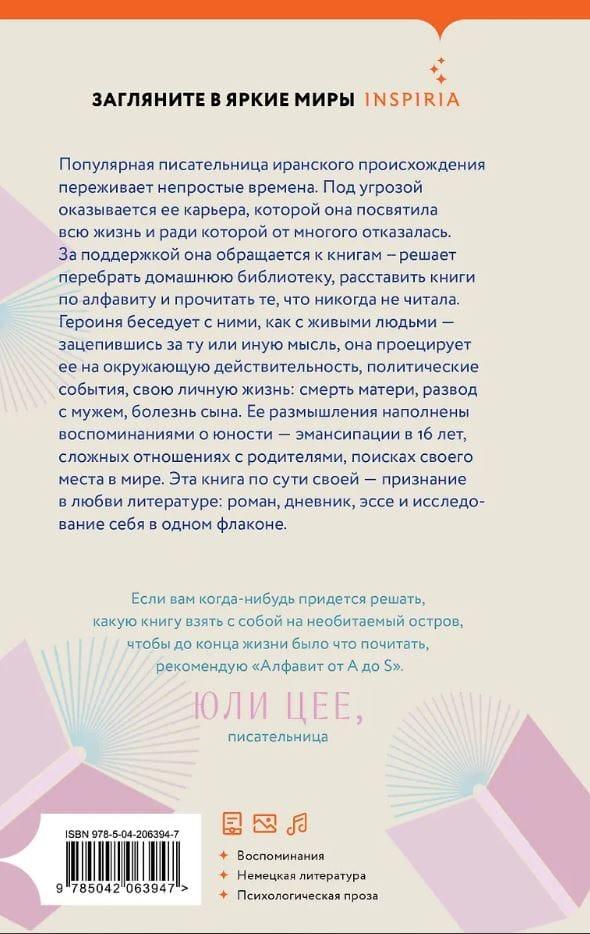 Популярная писательница иранского происхождения переживает непростые времена. Под угрозой оказывается ее карьера, которой она посвятила всю жизнь и ради которой от многого отказалась. За поддержкой она обращается к книгам — решает перебрать домашнюю библиотеку, расставить книги по алфавиту и прочитать те, что никогда не читала. Героиня беседует с ними, как с живыми людьми — зацепившись за ту или иную мысль, она проецирует ее на окружающую действительность, политические события, свою личную жизнь: смерть матери, развод с мужем, болезнь сына. Ее размышления наполнены воспоминаниями о юности — эмансипации в 16 лет, сложных отношениях с родителями, поисках своего места в мире. Эта книга по сути своей — признание в любви литературе: роман, дневник, эссе и исследование себя в одном флаконе.