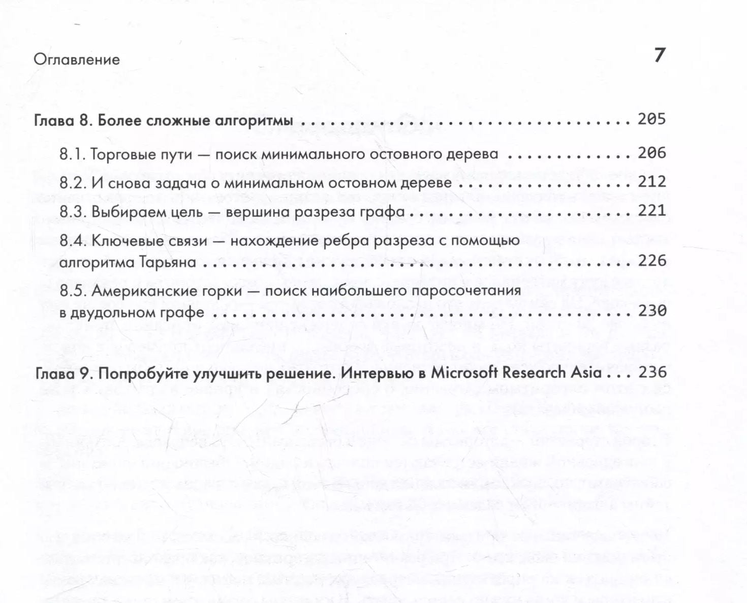 В число алгоритмов, рассмотренных в книге, вошли различные методы сортировки, перебор, поиск в глубину и ширину, обход графов, четыре алгоритма поиска кратчайшего пути, два алгоритма минимального остовного дерева, алгоритмы определения вершин и ребер разреза, а также поиск наибольшего паросочетания в двудольных графах и многое другое.
