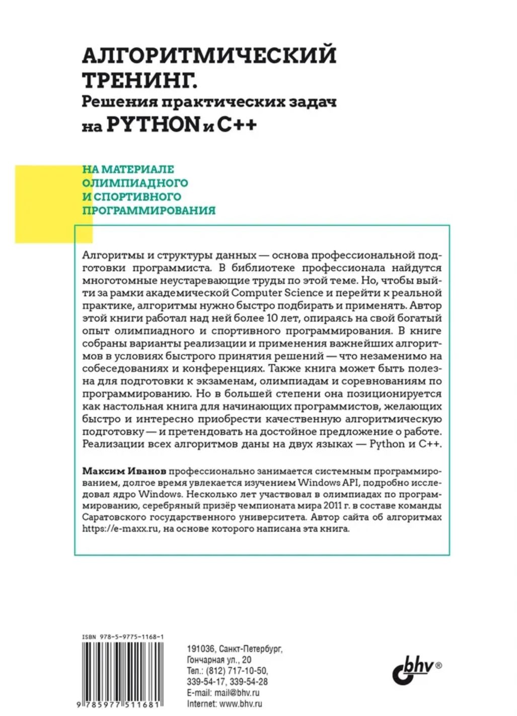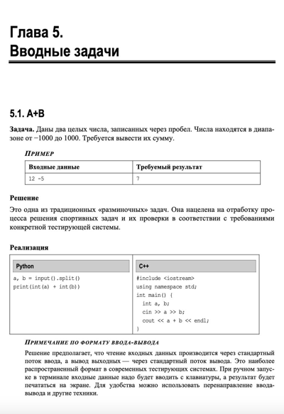 Опираясь на богатый соревновательный и эвристический опыт, автор предлагает оригинальные реализации классических алгоритмов Computer Science на языках Python и C++. Особое внимание уделено математическим и геометрическим алгоритмам, графовым алгоритмам, структурам данных (в особенности различным деревьям), комбинаторике и работе со строками. Книга поможет заложить и расширить алгоритмическую подготовку, познакомит с эффективными решениями вычислительных задач, а для обучающихся станет настольной. Поможет подготовиться к экзаменам, сертификации, олимпиадам по программированию.