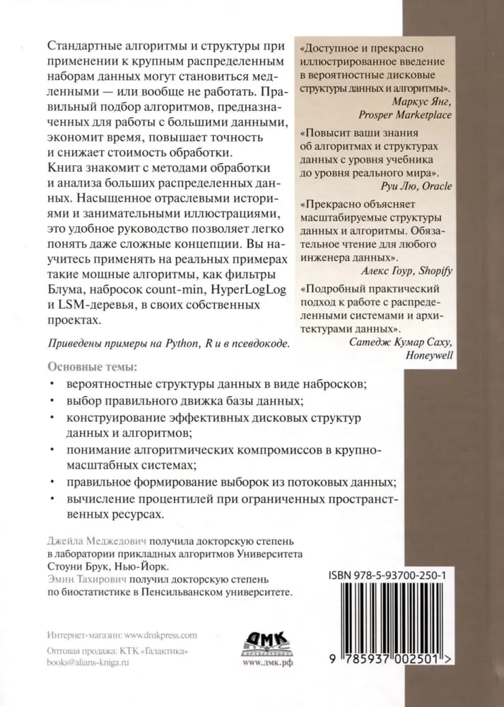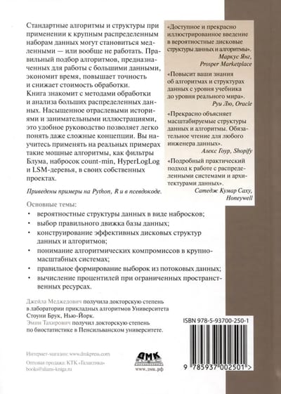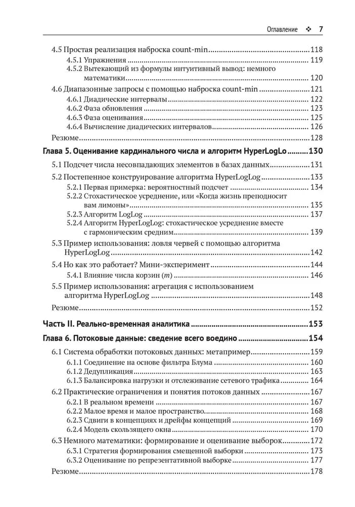 и снижает стоимость обработки. Книга знакомит с методами обработки и анализа больших распределенных данных. Насыщенное отраслевыми историями и занимательными иллюстрациями, это удобное руководство позволяет легко понять даже сложные концепции. Вы научитесь применять на реальных примерах такие мощные алгоритмы, как фильтры Блума, набросок count-min, HyperLogLog и LSM-деревья, в своих собственных проектах. Приведены примеры на Python, R и в псевдокоде.