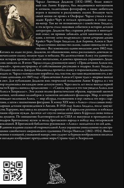 В данном издании сказки об очаровательной Алисе украшены уникальными иллюстрациями самобытного американского художника Питера Ньюэлла (1862–1924). Выполненные в изящной, узнаваемой манере, они следуют за бурным воображением писателя и наглядно изображают причудливые миры Страны чудес и Зазеркалья.