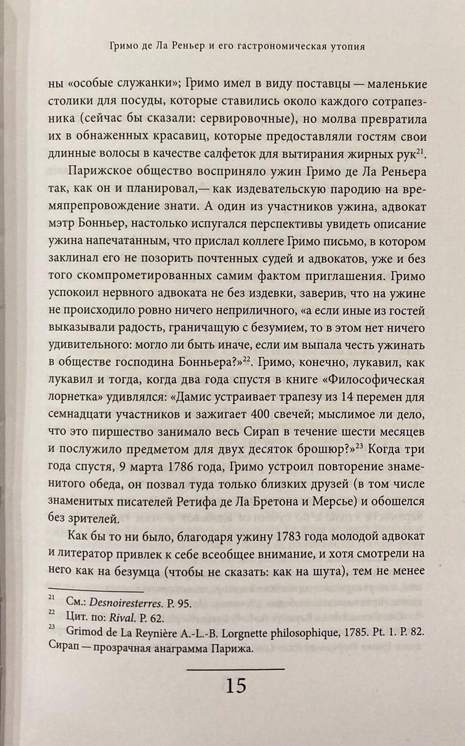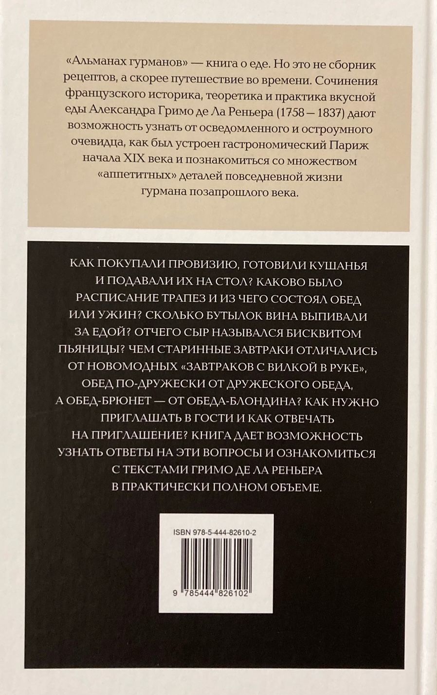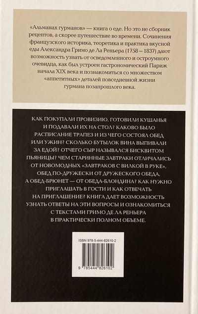 «Альманах Гурманов» — книга о еде. Но это не сборник рецептов, а скорее путешествие во времени. Сочинения французского историка, теоретика и практика вкусной еды Александра Гримо де Ла Реньера (1758–1837) дают возможность узнать от осведомленного и остроумного очевидца, как в Париже начала XIX века покупали провизию, готовили кушанья и подавали их на стол, каково было расписание трапез и из чего состоял обед или ужин; сколько бутылок вина выпивали за едой; отчего сыр назывался бисквитом пьяницы; чем старинные завтраки отличались от новомодных «завтраков с вилкой в руке», обед по-дружески от дружеского обеда, а обед-брюнет — от обеда-блондина; как нужно приглашать в гости и как отвечать на приглашение, и еще множество «аппетитных» деталей повседневной жизни гурмана позапрошлого века, которых не узнаешь из других книг. Русский читатель получает возможность ознакомиться с текстами Гримо де Ла Реньера в практически полном объеме. Книга подготовлена Верой Мильчиной, ведущим научным сотрудником ИВГИ РГГУ и ШАГИ РАНХиГС.