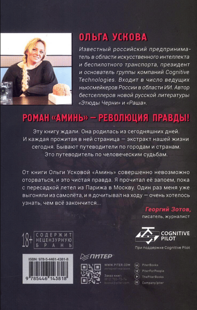 «Аминь» — это уже четвёртый роман Ольги Усковой, основательницы и президента группы компаний Cognitive Technologies, разработчиков роботов и технологий искусственного интеллекта. Вместе со своей командой Ольга Анатольевна создаёт новый мир, где люди и роботы трудятся вместе. Одновременно как автор книг она описывает всё происходящее с человечеством сегодня в захватывающих, правдивых историях. Первые три романа «Этюды Черни», «Раша», «Си-Пи» уже стали бестселлерами и шагнули к читателям в Израиле, США, Франции, Германии.
