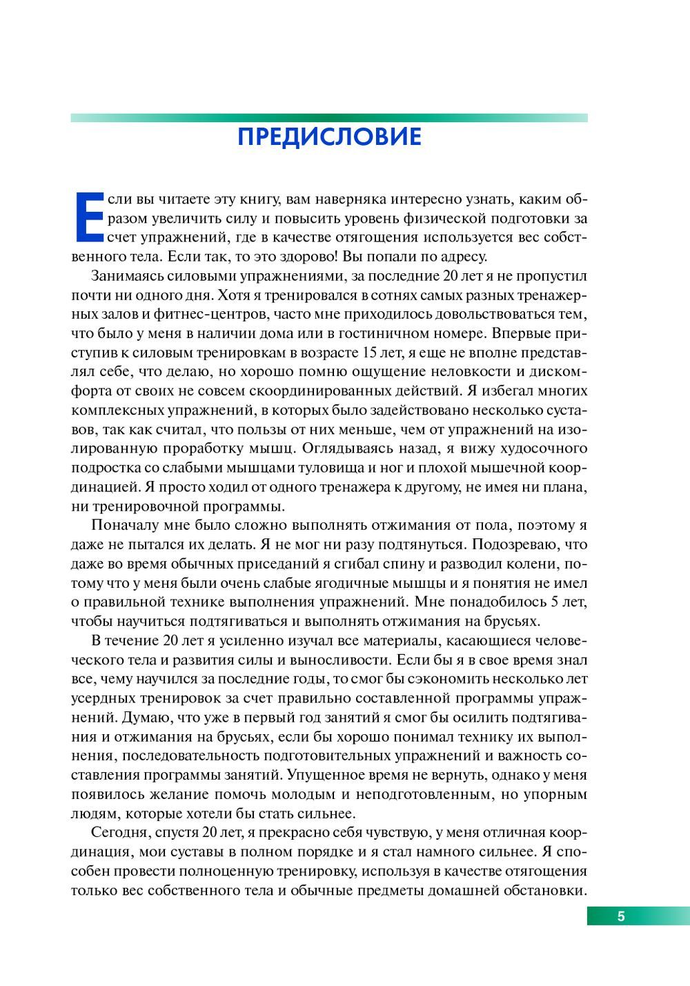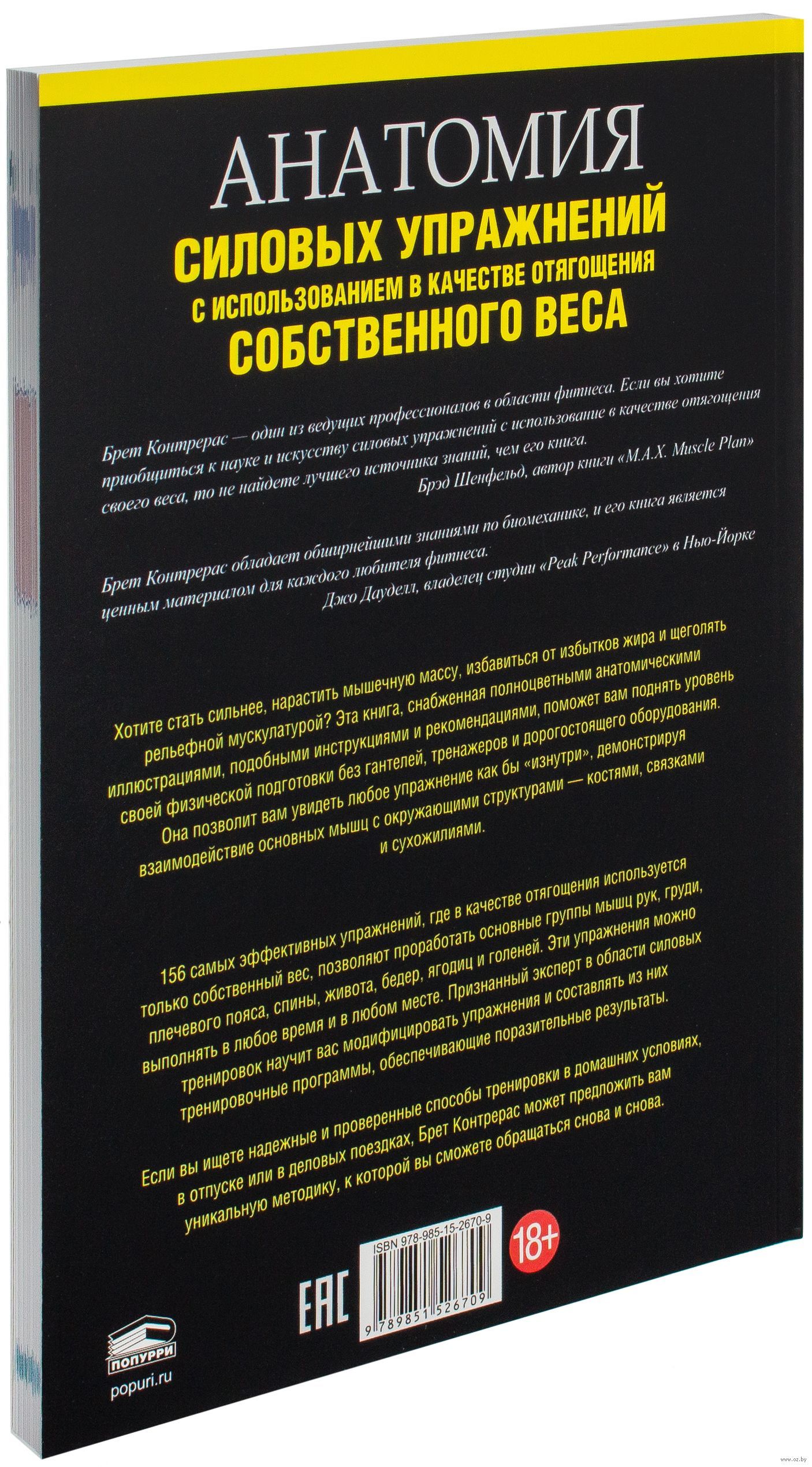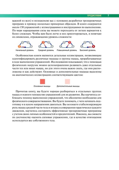 Приводится 156 эффективных упражнений, позволяющих проработать основные группы мышц рук, груди, плечевого пояса, спины, живота, бедер, ягодиц и голеней, в которых в качестве отягощения используется только собственный вес. Книга снабжена полноцветными анатомическими иллюстрациями, подробными инструкциями и рекомендациями. Даются тренировочные программы, обеспечивающие постоянный прирост результатов. Для широкого круга читателей.