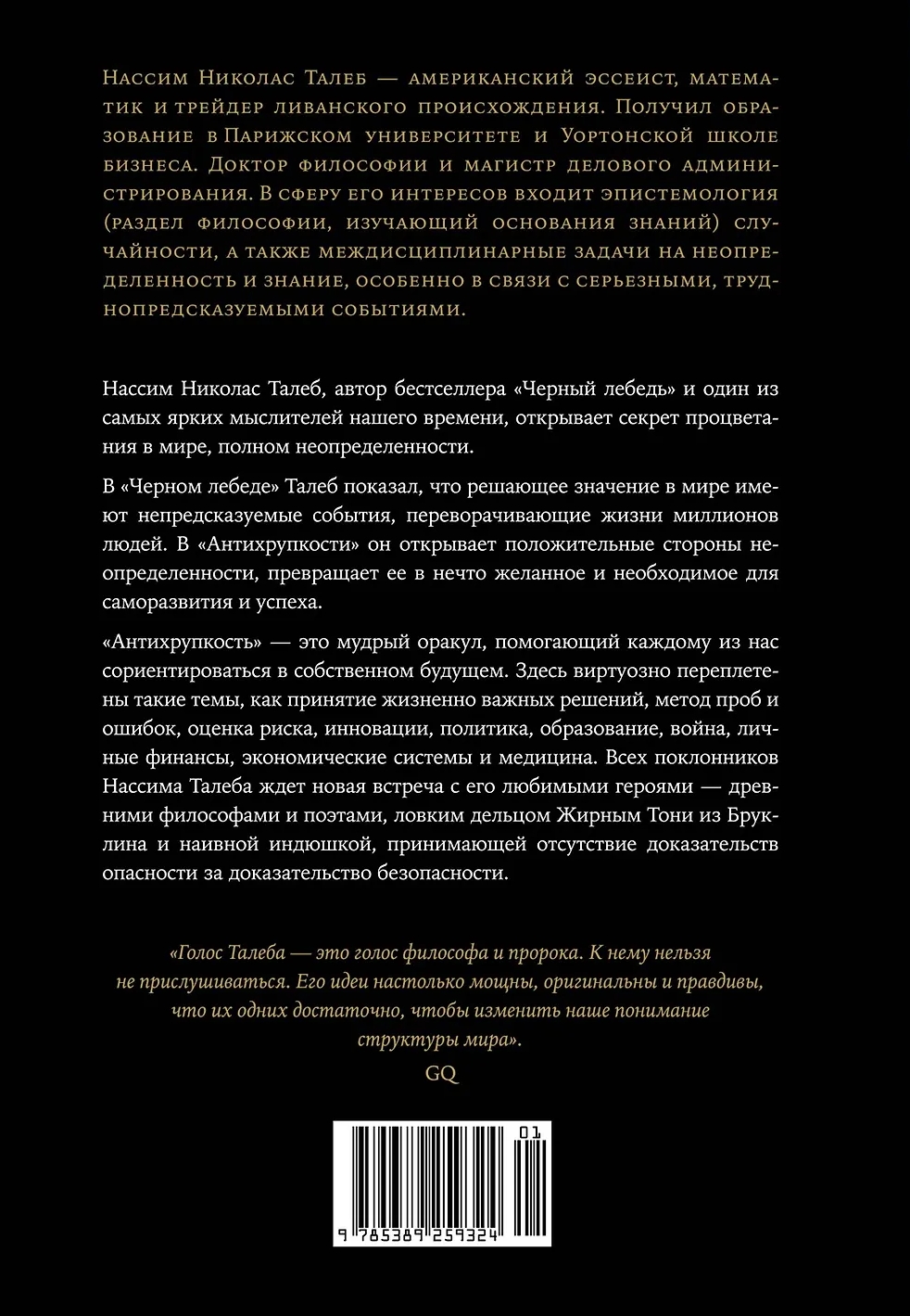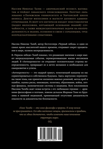 «Антихрупкость» — книга уникальная: она рассказывает о ключевом свойстве людей, систем и не только, свойстве, у которого до сих пор не было названия. В мире, где царит неопределенность, нельзя желать большего, чем быть антихрупким, то есть уметь при столкновении с хаосом жизни не просто оставаться невредимым, но и становиться лучше прежнего, эволюционировать, развиваться. Талеб формулирует простые правила, которые позволяют нам преодолеть хрупкость и действовать так, чтобы непредсказуемая неопределенность, тот грозный и внезапный Черный лебедь, не причинила нам вреда — и более того, чтобы эта редкая и сильная птица помогла нам совершенствоваться. Для этого следует в первую очередь осознать: мы по природе своей антихрупки и не должны позволять кому бы то ни было лишать нас этого чудесного свойства.