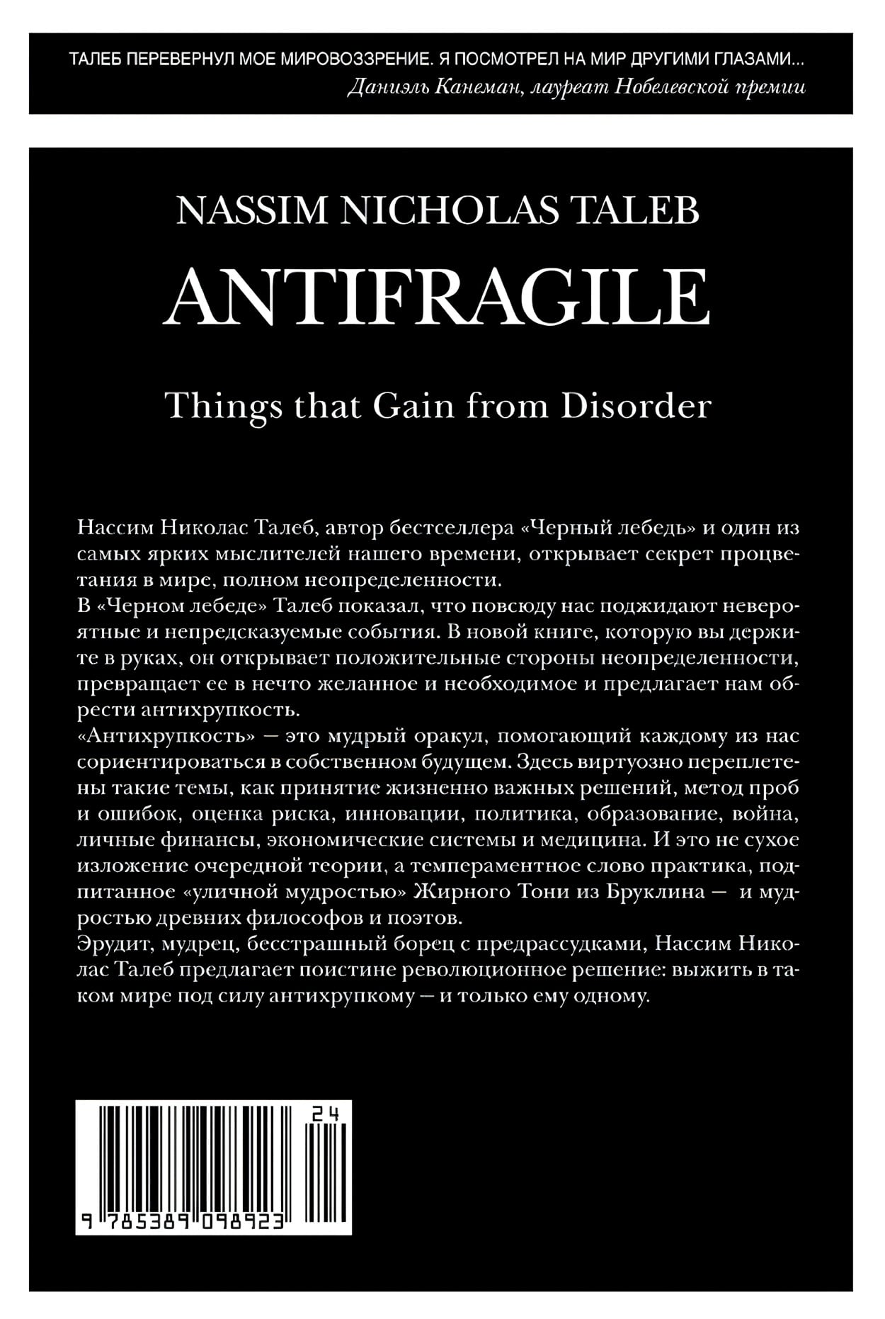 «Антихрупкость» — книга уникальная: она рассказывает о ключевом свойстве людей, систем и не только, свойстве, у которого до сих пор не было названия. В мире, где царит неопределенность, нельзя желать большего, чем быть антихрупким, то есть уметь при столкновении с хаосом жизни не просто оставаться невредимым, но и становиться лучше прежнего, эволюционировать, развиваться. Талеб формулирует простые правила, которые позволяют нам преодолеть хрупкость и действовать так, чтобы непредсказуемая неопределенность, этот грозный и внезапный Черный лебедь, не причинила нам вреда — и более того, чтобы эта редкая и сильная птица помогла нам совершенствоваться. Для этого следует в первую очередь осознать: мы по природе своей антихрупки — и не должны позволять кому бы то ни было лишать нас этого чудесного свойства.
