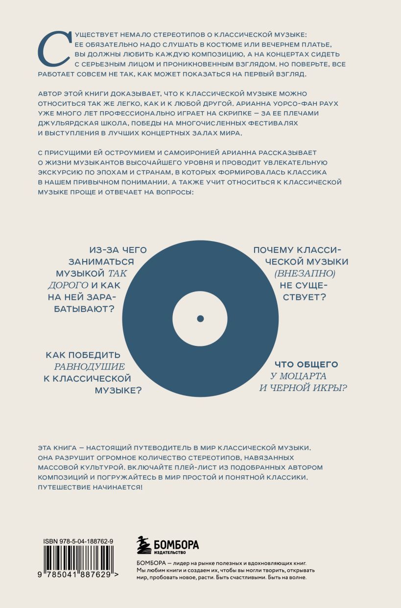 Профессиональная скрипачка Арианна Уорсо-Фан Раух в своей увлекательной и невероятно остроумной книге исследует мир классической музыки, развенчивает стереотипы о ее элитарности, раскрывает тайны закулисного мира утонченного академического искусства и отвечает на самые животрепещущие вопросы: - Как формировалась история классической музыки и в чем ее уникальность? - Как заработать на музыке? - Что значит быть музыкантом высочайшего уровня? - Существует ли классическая музыка как явление? Профессионализм автора умело переплетается с самоиронией, а также уникальным ироничным подходом к элитарной сфере музыкального искусства, которая на самом деле оказывается совсем не скучной — она полна драмы, интриг, сюрпризов и удивительных парадоксов. Откройте книгу и погрузитесь в этот чудесный мир!