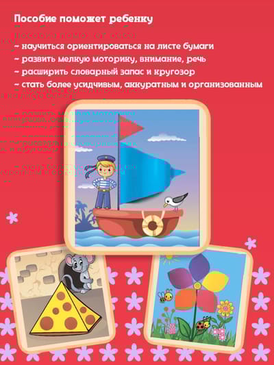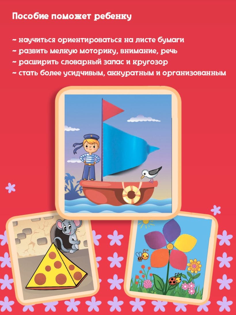Аппликация-вырезалка поможет ребёнку развить творческие способности и станет хорошей альтернативой гаджетам. Благодаря интересным сюжетам и постепенно усложняющимся заданиям ребёнок разовьёт мелкую моторику, логическое и пространственное мышление, фантазию, внимание, воображение, подготовит руку к письму, расширит словарный запас и кругозор. Кроме того, занимаясь, малыш научится пользоваться ножницами и клеем. Все эти навыки помогут малышу почувствовать уверенность в своих силах, ведь ситуация успеха очень важна в обучении ребёнка. Пособие содержит заготовки для 20 творческих занятий. С помощью готовых шаблонов вы сможете провести с малышом увлекательные занятия по классической аппликации, а также с нестандартными материалами (вата, пластилин, цветные салфетки, ватные палочки), ватные диски.