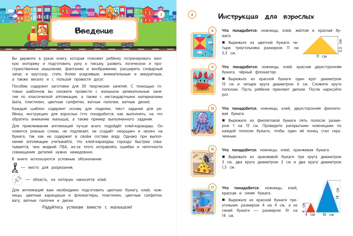 Каждый шаблон содержит основу для поделки, текст задания для ребёнка, инструкцию для взрослых (что понадобится, как выполнять, на что обратить внимание малыша), а также пример выполненного задания. В конце книги ребёнка ожидает сюрприз — диплом за старание и выполнение всех заданий.