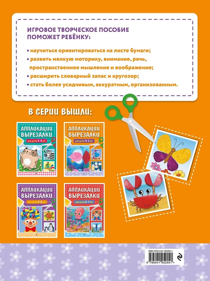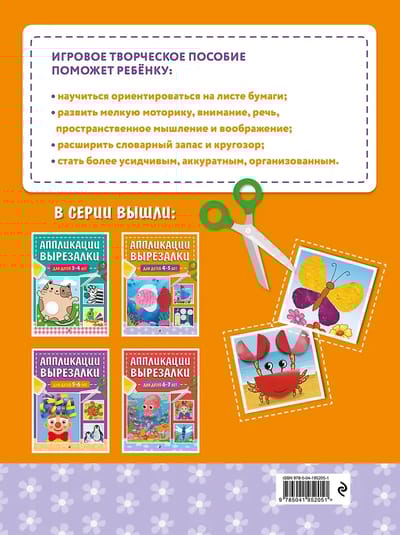 Книга серии «Аппликации-вырезалки для дошколят» издательства «Эксмо» будет лучшим подарком малышу и настоящей находкой для неравнодушных родителей, которые хотят развить ребёнка и занять его полезным и интересным делом.