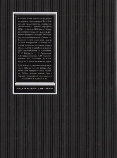 В книге видного историка архитектуры Б. М. Кирикова представлены «портреты» общественных зданий середины 1900-х — начала 1910-х гг. — периода зрелого и позднего модерна. Детально раскрыты история их создания и архитектурные особенности. Важное место занимают храмы разных конфессий, в облике которых отразилось влияние нового стиля. Автор подробно анализирует произведения Ф. И. Лидваля, Э. Ф. Вирриха, Н. В. Васильева, Г. В. Барановского, М. М. Перетятковича, М. С. Лялевича, В. А. Покровского и других архитекторов. Развитие новаторской линии модерна прослеживается вместе с возрождением исторических традиций, которые вступали во взаимодействие с новым стилем.
