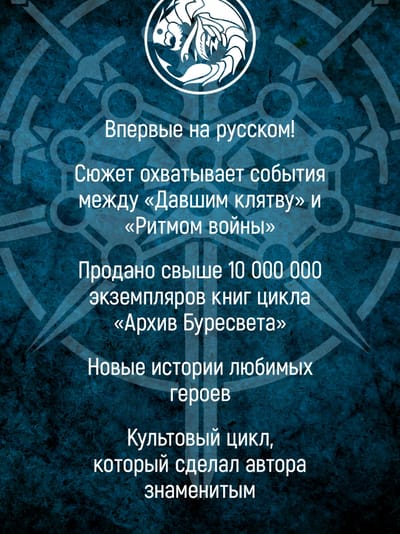 От автора «Архива Буресвета», фэнтезийного цикла №1 в списке бестселлеров «New York Times» — спин-офф, сюжетно расположенный между «Давшим клятву» и «Ритмом войны».
