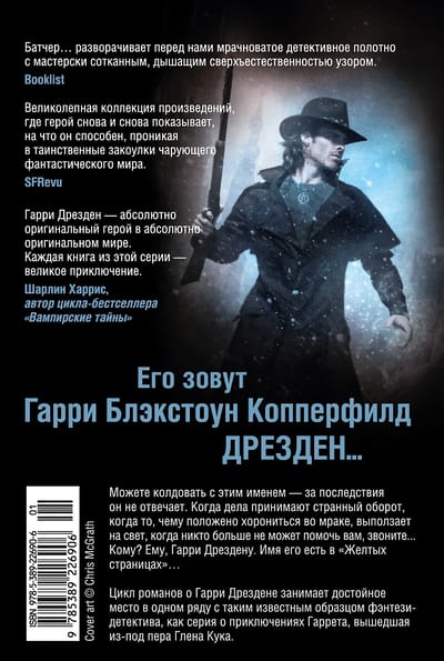 Его зовут Гарри Блэкстоун Копперфилд Дрезден. Можете колдовать с этим именем — за последствия он не отвечает. Когда дела принимают странный оборот, когда то, чему положено хорониться во мраке, выползает на свет, когда никто больше не может помочь вам, звоните... Кому? Ему, Гарри Дрездену. Имя его есть в «Желтых страницах»… Не очень-то приятно, когда тебя убивают. Вот и Гарри Дрезден думает точно так же. Но представьте себе его удивление, когда вместо тихого местечка на кладбище он оказывается в Чикаго-Между — городе-чистилище, между миром мертвых и миром живых. И у Гарри теперь есть лишь два пути: либо остаться здесь и заняться полицейской работой, либо отправиться в мир живых, чтобы раскрыть собственное убийство. Правда, не иначе как в виде призрака. Гарри выбирает второе («История призрака»). Час от часу не легче. Мэб, Королева Воздуха и Тьмы, поручает Гарри — а он ее Зимний Рыцарь и ослушаться приказов Королевы не может — убить не кого-нибудь, а свою дочь Мэйв, Зимнюю Леди. Но та, как и все фэйри, бессмертна. Поэтому задача невыполнима. Вроде бы. Да и надо ли подчиняться Мэб? А вдруг она повредилась в уме? Или ею управляют какие-нибудь темные силы? В общем, для чародея Гарри куда ни сунься — одни проблемы («Холодные дни»). Цикл романов о Гарри Дрездене занимает достойное место в одном ряду с таким известным образцом фэнтези-детектива, как сериал о приключениях Гаррета, вышедший из-под пера Глена Кука.