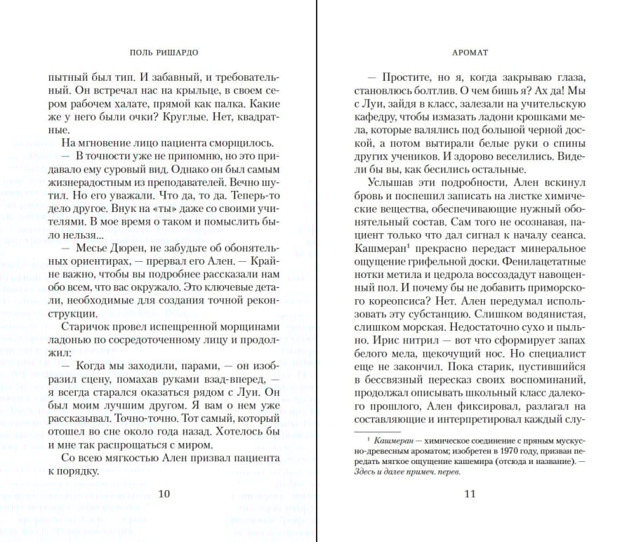 Поль Ришардо знает, о чем говорит, — он и сам парфюмер. Ришардо воспитан на «Парфюмере» Зюскинда и «твердой» научной фантастике, и потому в его сенсорном триллере «Аромат» парфюмерия строго научна (не считая одного фантастического допущения), а сюжет держит за горло. Даже его вымышленная зловещая корпорация родилась из реально ходившего во французских профессиональных кругах анекдота о том, как некто планировал подпольно ароматизировать алкоголь, чтобы потом контрабандой ввозить его в СССР.