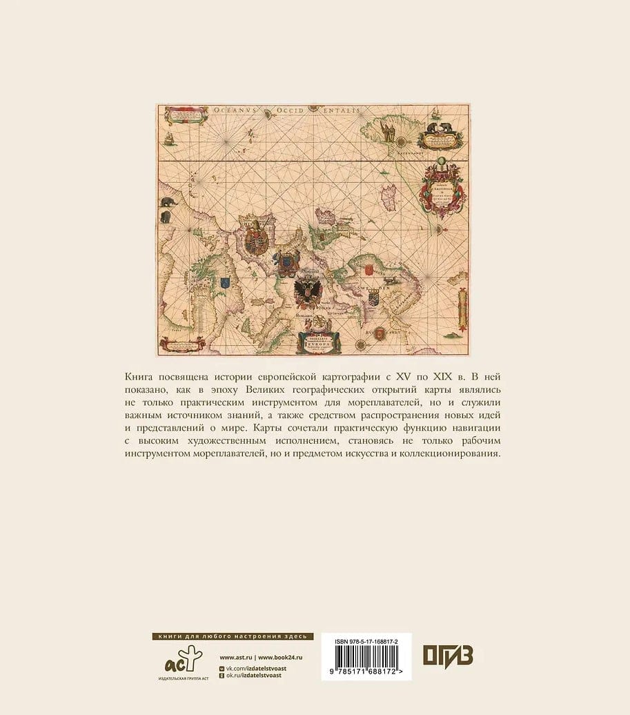Книга посвящена истории европейской картографии с XV по XIX в. В ней показано, как в эпоху Великих географических открытий карты являлись не только практическим инструментом для мореплавателей, но и служили важным источником знаний, а также средством распространения новых идей и представлений о мире. Карты сочетали практическую функцию навигации с высоким художественным исполнением, становясь не только рабочим инструментом мореплавателей, но и предметом искусства и коллекционирования.