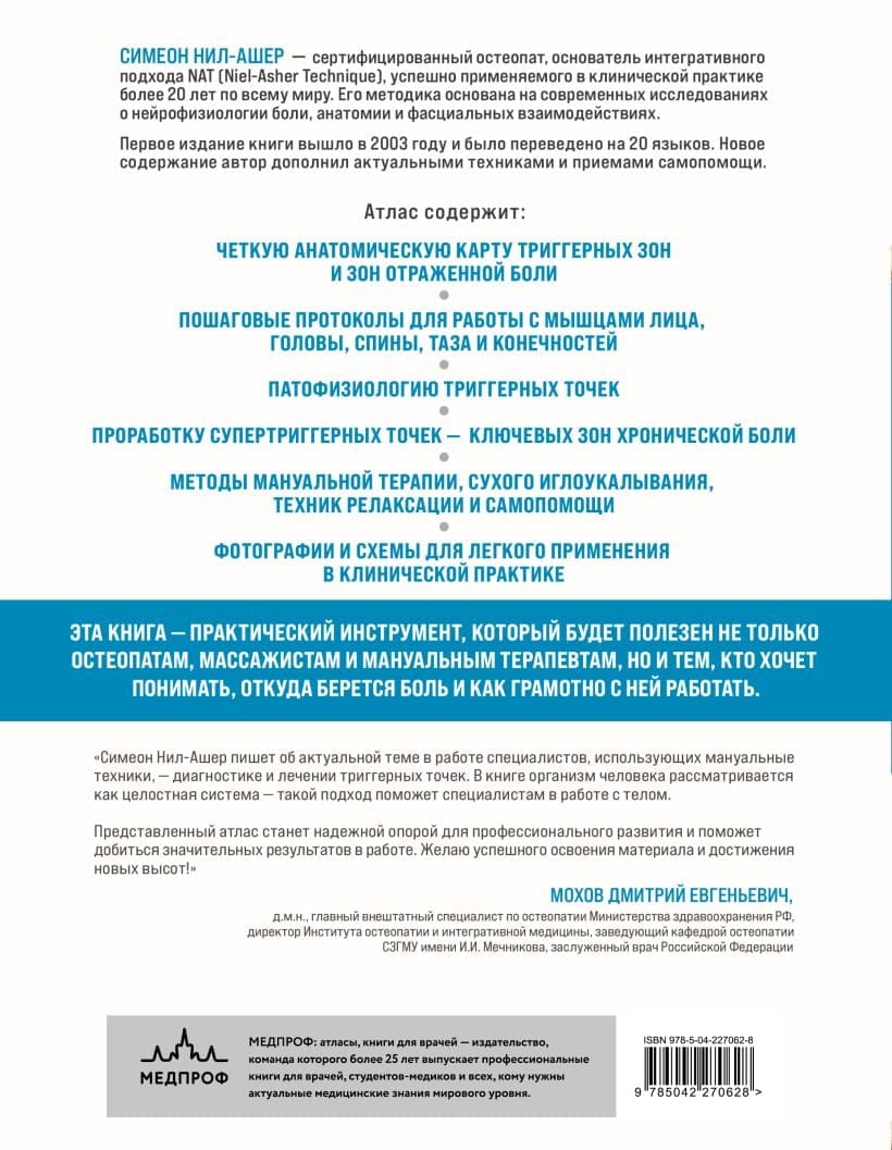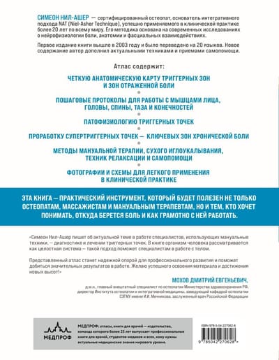 Триггерные точки — одна из ключевых причин острой и хронической миофасциальной боли. По оценкам экспертов, они участвуют в развитии 75—95% болевых синдромов и нередко сопровождаются отеками, головокружением, нарушениями осанки и сна. В книге ведущего британского остеопата Симеона Нил-Ашера представлен структурированный, клинически проверенный подход к диагностике и терапии миофасциальной боли. Его методика применяется по всему миру и переиздана более чем на 20 языках. Атлас содержит четкие алгоритмы поиска и устранения триггерных точек; практические протоколы для работы с различными зонами тела; рекомендации по домашней самопомощи для пациентов.