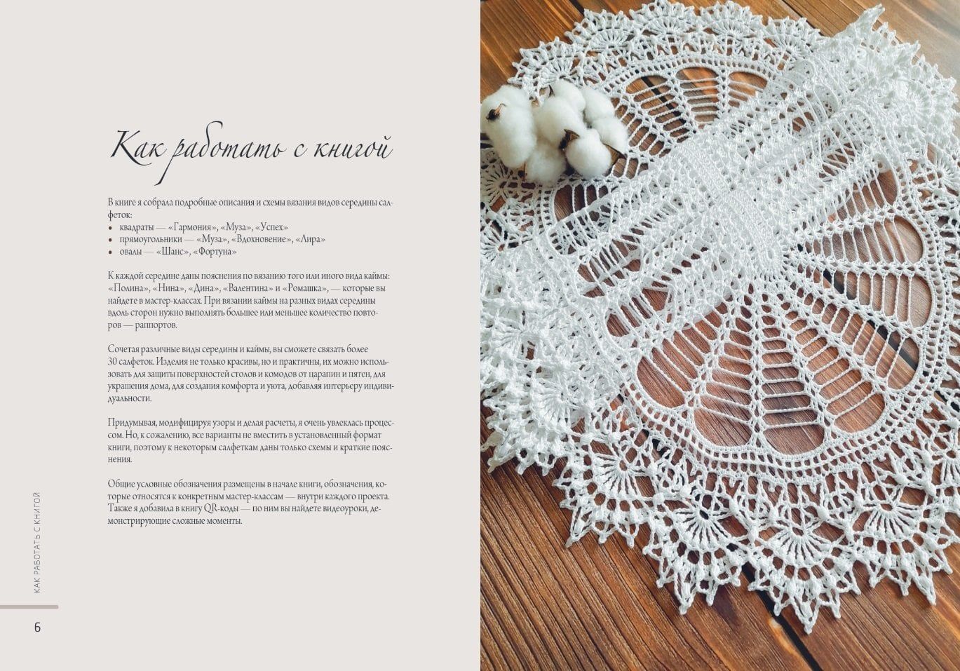 Сочетая между собой несколько видов изысканной каймы и варианты серединок для квадратных, овальных и салфеток-дорожек, выбирая варианты колористики и толщины ниток, вы создадите множество разных изделий, каждое из которых станет самостоятельным произведением искусства! А ведь это именно искусство: не только украшение интерьера, но и уникальный способ самовыражения в творчестве! Это роскошное хобби развивает внимательность, служит разминкой для рук и тренажером для мозга. Множество курсов и мастер-классов по всему миру, от Японии до Швеции, в некоторых странах даже проводят чемпионаты по вязанию салфеток, и они неизменно собирают сотни зрителей. Приобщитесь и вы к этому прекрасному виду ручного творчества!