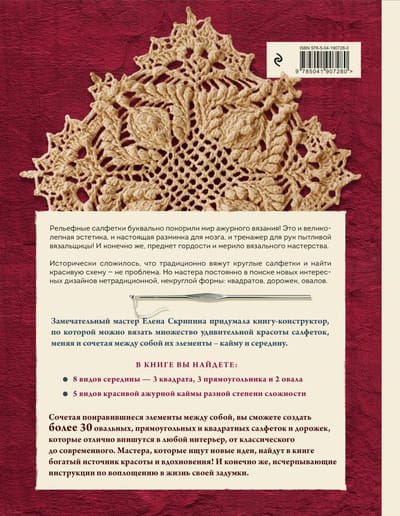 Первое полномасштабное издание, посвященное не просто вязанию, а самостоятельной разработке рельефных салфеток разнообразной формы от российского мастера с огромным стажем Елены Скрипиной! Успех ее книги о вязании круглых рельефных салфеток показал огромный интерес к этому виду ажурного вязания крючком. Научиться вязать такое ажурное и объемное чудо кажется многим непосильной задачей, но следуя инструкциям из книги и разбирая схемы под чутким руководством автора, вы легко освоите новое для себя рукоделие.