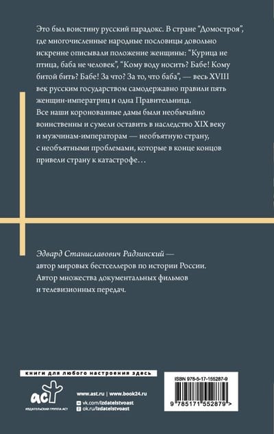 Это был воистину русский парадокс. В стране «Домостроя», где многочисленные народные пословицы довольно искренне описывали положение женщины: «Курица не птица, баба не человек», «Кому воду носить? Бабе! Кому битой бить? Бабе! За что? За то, что баба», – весь XVIII век русским государством самодержавно правили пять женщин-императриц и одна Правительница. Все коронованные дамы были необычайно воинственны и сумели оставить в наследство XIX веку и мужчинам-императорам – необъятную страну, с необъятными проблемами, которые в конце концов привели страну к катастрофе…