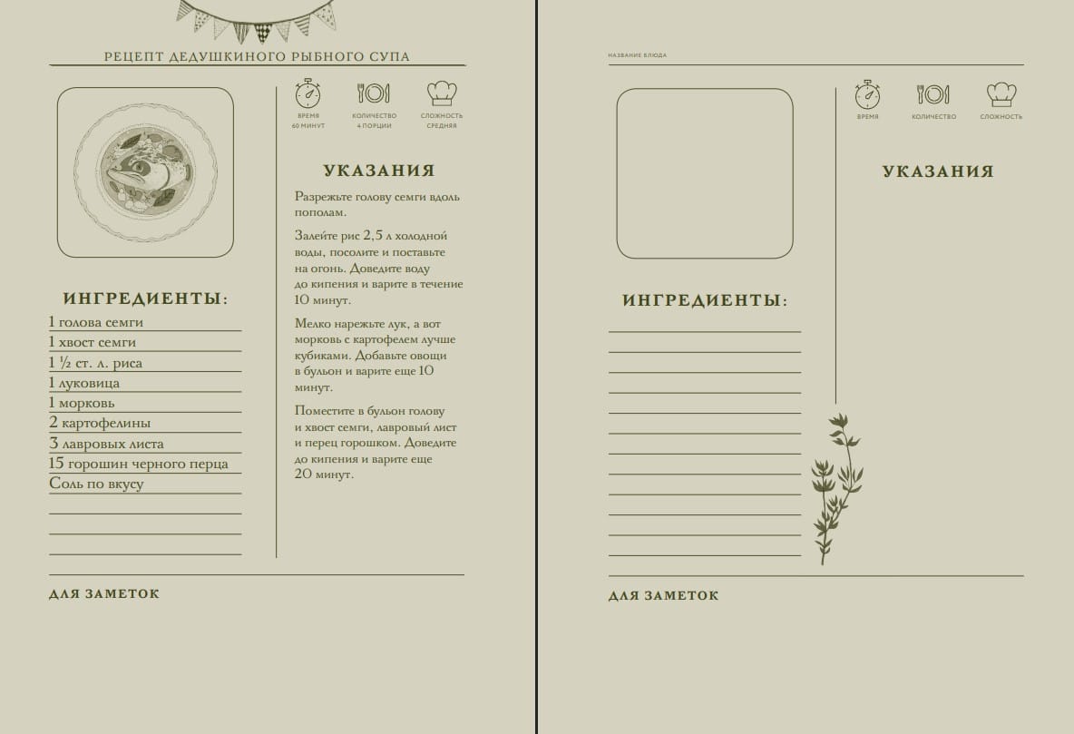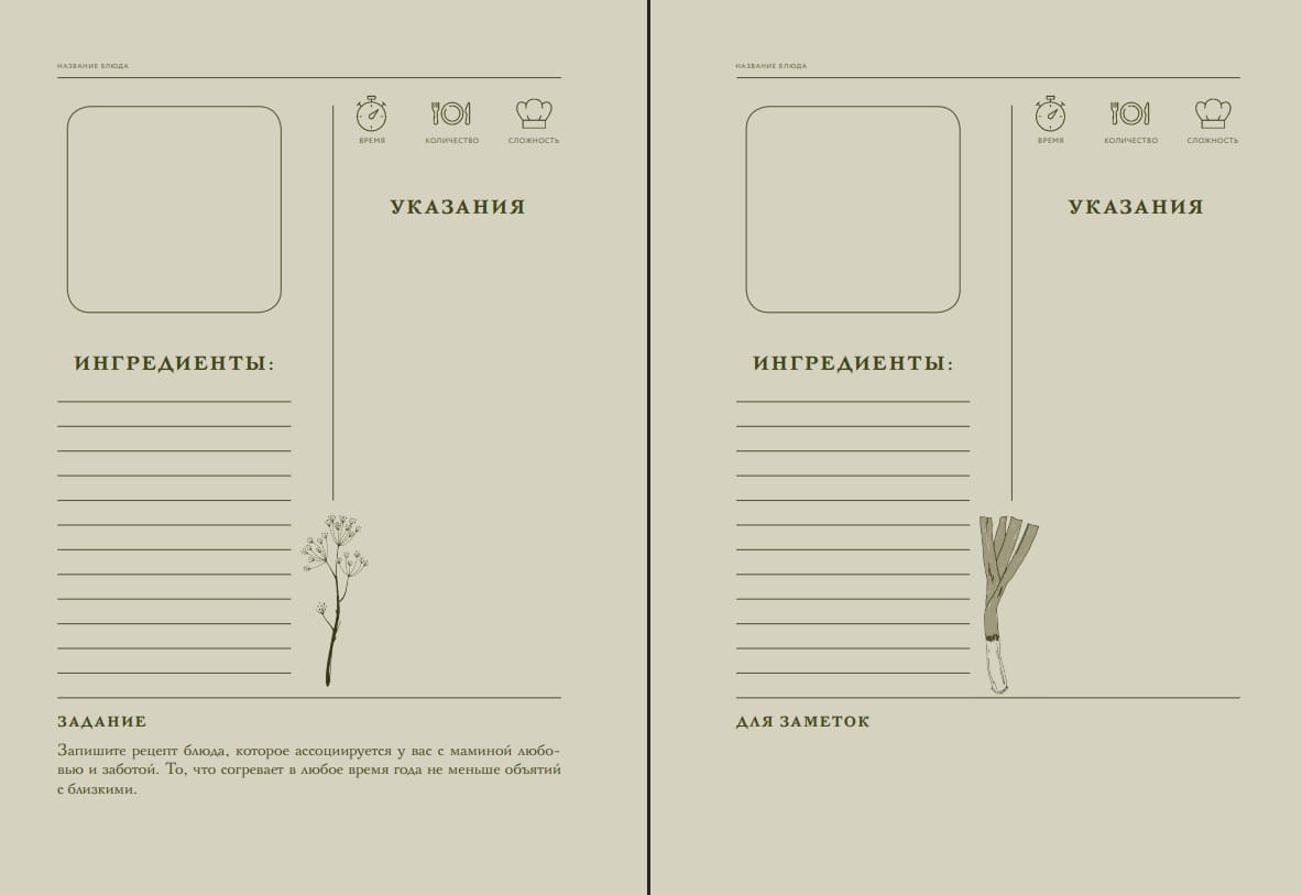 Внутри вы найдете тематические задания и вопросы для сближения, рецепты и советы по приготовлению, а также удобные поля для записи ваших собственных кулинарных шедевров.