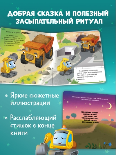«Баю-бай, экскаватор» — добрая история для вечернего чтения с плотными картонными страничками и яркими сюжетными картинками. В конце книги вас ждет расслабляющий стишок для быстрого засыпания.