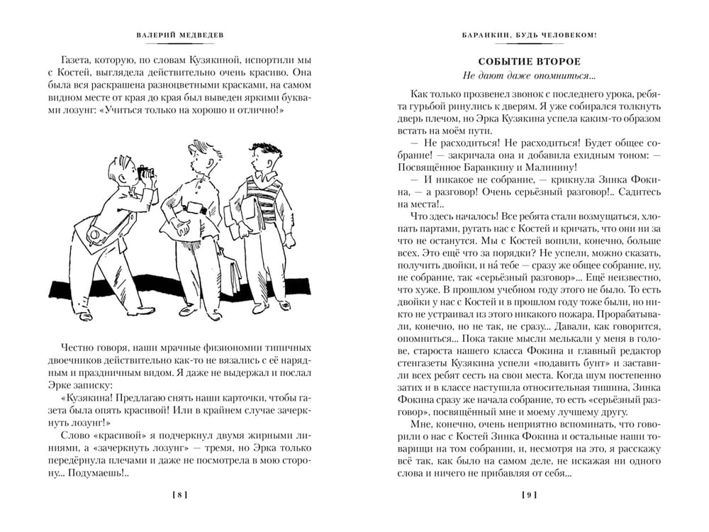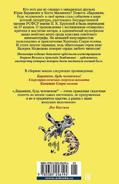 Нелегка жизнь Юрки Баранкина. От окружающих он только и слышит: «Баранкин, будь человеком!» Но что, если Юрка устал им быть? Схлопочешь всего одну двойку по геометрии, и приходится учиться в свой единственный выходной, да ещё и в школьном саду работать. Жуткая несправедливость. Вот бы стать воробьём или бабочкой и жить себе, не зная забот. Но Юрка и представить не мог, что это его желание неожиданно сбудется… Диме Колчанову в воображении тоже не откажешь, недаром друзья прозвали его Капитан Соври-голова. То он клад ищет, то змей дрессирует, а то и вовсе совершает научное закрытие. Правда, собственные выдумки порой выходят ему боком, но таков уж Капитан — ни дня без приключений прожить не может. Любимые многими поколениями читателей произведения Валерия Медведева, включённые в настоящий сборник, дополнены чудесными иллюстрациями Генриха Валька и Арнольда Тамбовкина — художников, мастерству которых история давно поставила высший балл.