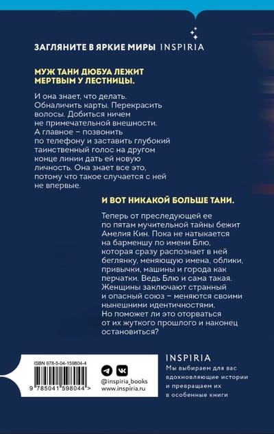 И вот никакой больше Тани. Теперь от преследующей ее по пятам мучительной тайны бежит новая личина: Амелия Кин. Пока не натыкается на барменшу по имени Блю, которая сразу распознает в ней беглянку, меняющую имена, облики, привычки, машины и города как перчатки. Ведь Блю и сама такая. Женщины заключают странный и опасный союз – меняются своими нынешними идентичностями. Но поможет ли это оторваться от их жуткого прошлого и наконец остановиться?