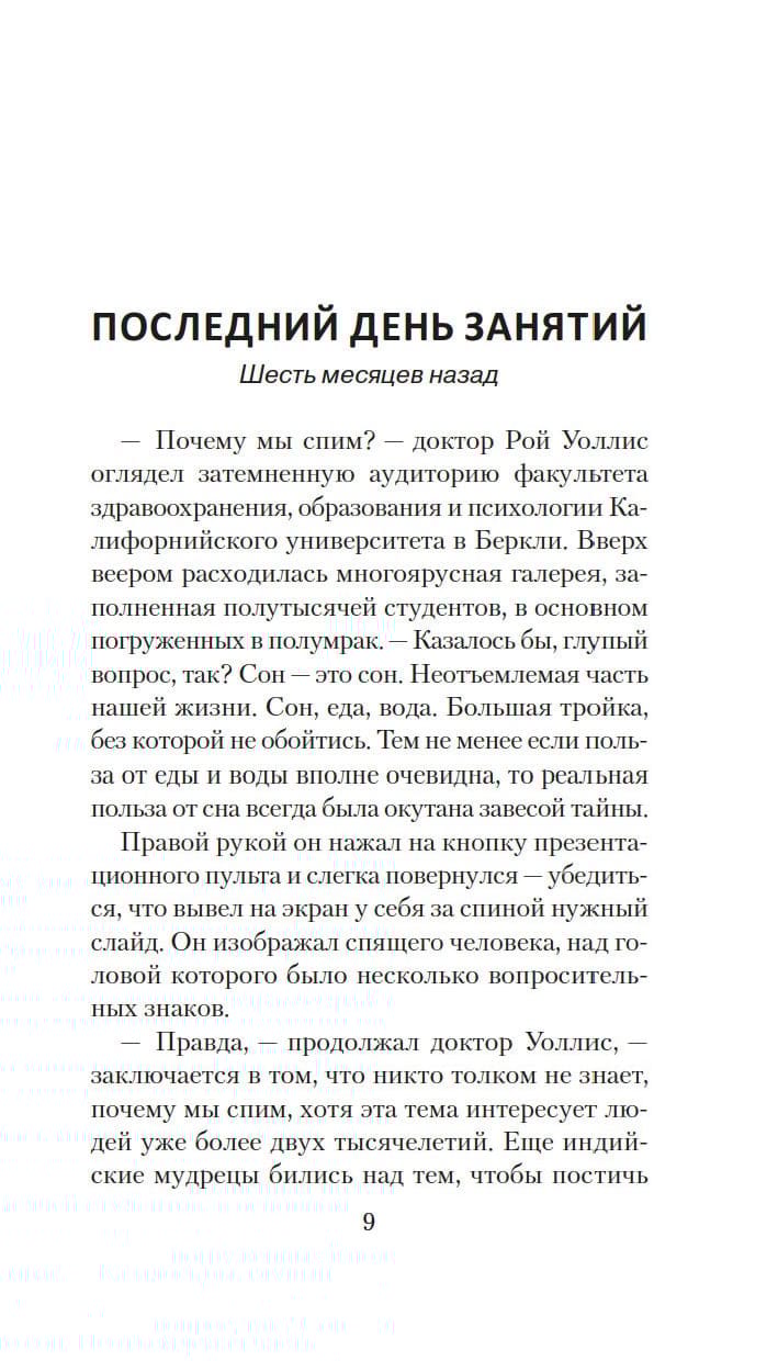 Действительно ли человеку жизненно необходим сон? Или это своего рода атавизм, унаследованный от доисторических предков? Видный психолог Рой Уоллис из университета в Беркли считает, что люди вполне могут обходиться без сна, и намерен доказать это на опыте, чтобы облагодетельствовать человечество и вписать свое имя в историю науки. Существует известная городская легенда, что в 1954 году в СССР провели эксперимент по лишению сна на заключенных, пообещав им свободу. Никто из подопытных не выжил… И в 2018 году профессор Уоллис получает разрешение провести аналогичный опыт на добровольцах. Что может пойти не так?