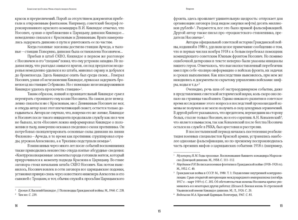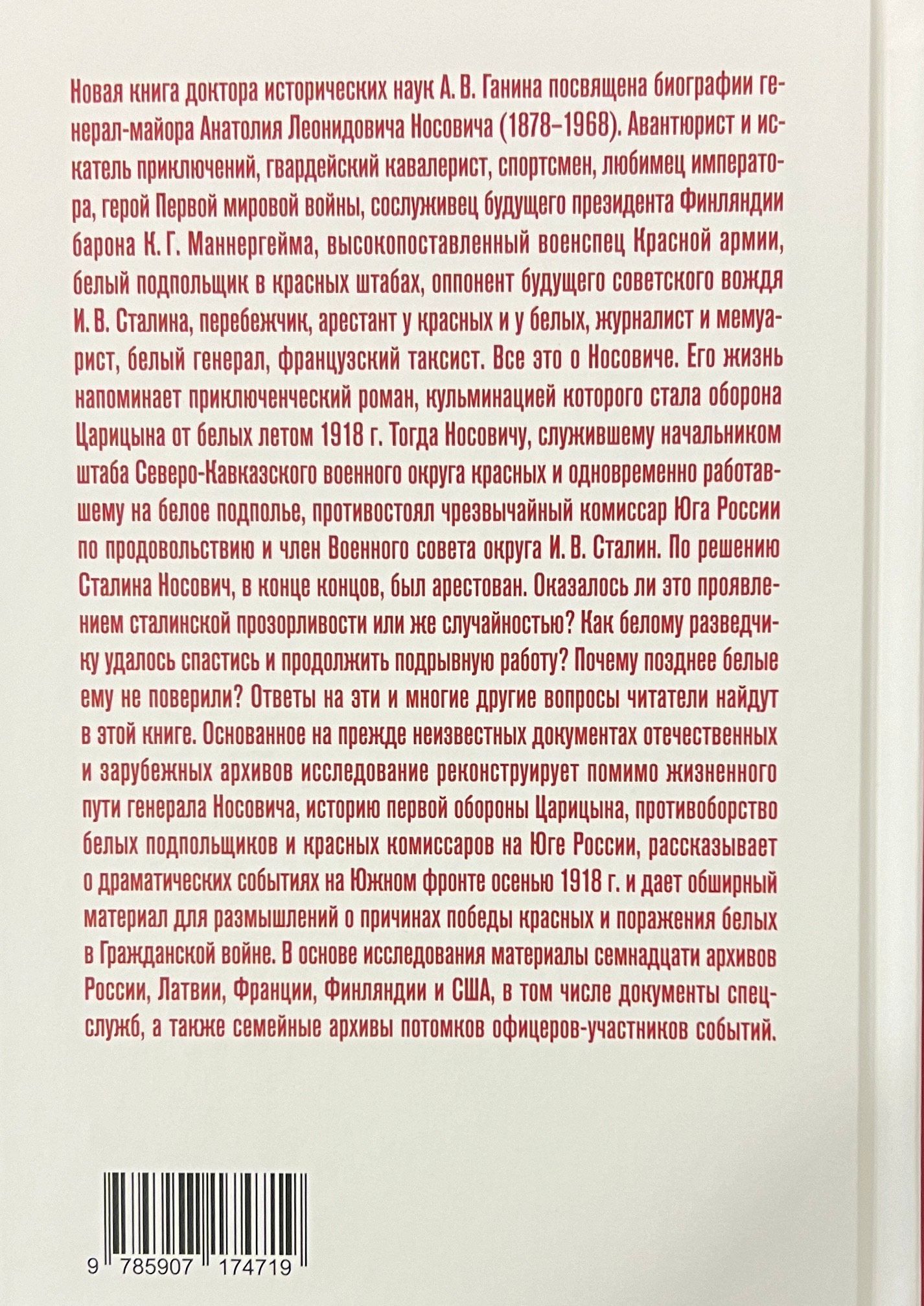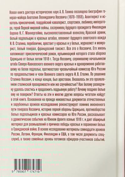 Новая книга доктора исторических наук А. В. Ганина посвящена биографии генерал-майора Анатолия Леонидовича Носовича (1878–1968). Авантюрист и искатель приключений, гвардейский кавалерист, спортсмен, любимец императора, герой Первой мировой войны, сослуживец будущего президента Финляндии барона К.Г. Маннергейма, высокопоставленный военспец Красной армии, белый подпольщик в красных штабах, оппонент будущего советского вождя И.В. Сталина, перебежчик, арестант у красных и у белых, журналист и мемуарист, белый генерал, французский таксист. Все это о Носовиче. Его жизнь напоминает приключенческий роман, кульминацией которого стала оборона Царицына от белых летом 1918 г. Тогда Носовичу, служившему начальником штаба Северо-Кавказского военного округа красных и одновременно работавшему на белое подполье, противостоял чрезвычайный комиссар Юга России по продовольствию и член Военного совета округа И.В. Сталин. По решению Сталина Носович, в конце концов, был арестован. Оказалось ли это проявлением сталинской прозорливости или же случайностью? Как белому разведчику удалось спастись и продолжить подрывную работу? Почему позднее белые ему не поверили? Ответы на эти и многие другие вопросы читатели найдут на страницах этой книги. Основанное на прежде неизвестных документах отечественных и зарубежных архивов исследование реконструирует помимо жизненного пути генерала Носовича историю первой обороны Царицына, противоборство подпольщиков и красных комиссаров на Юге России, рассказывает о драматических событиях на Южном фронте осенью 1918 г. и дает обширный материал для размышлений о причинах победы красных и поражения белых в Гражданской войне. В основе исследования материалы семнадцати архивов России, Латвии, Франции, Финляндии и США, в том числе документы спецслужб, а также семейные архивы потомков офицеров — участников событий.