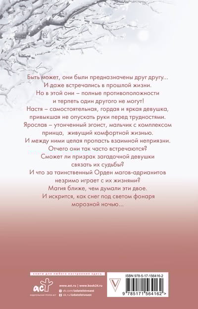 Быть может, они были предназначены друг другу... И даже встречались в прошлой жизни. Но в этой они — полные противоположности и терпеть один другого не могут! Настя — самостоятельная, гордая и яркая девушка, привыкшая не опускать руки перед трудностями. Ярослав — утонченный эгоист, мальчик с комплексом принца, живущий комфортной жизнью. И между ними целая пропасть взаимной неприязни. Отчего они так часто встречаются? Сможет ли призрак загадочной девушки связать их судьбы? И что за таинственный Орден магов-адрианитов незримо играет с их жизнями? Магия ближе, чем думали эти двое. И искрится, как снег под светом фонаря морозной ночью...