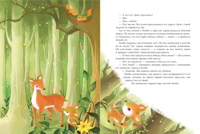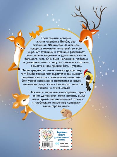 Это сказка о взрослении олененка, чувства и эмоции которого будут понятны малышам, ведь в них так легко увидеть свои. Бемби также проходит через трудности и страхи и учится быть сильным несмотря ни на что.