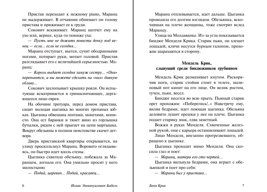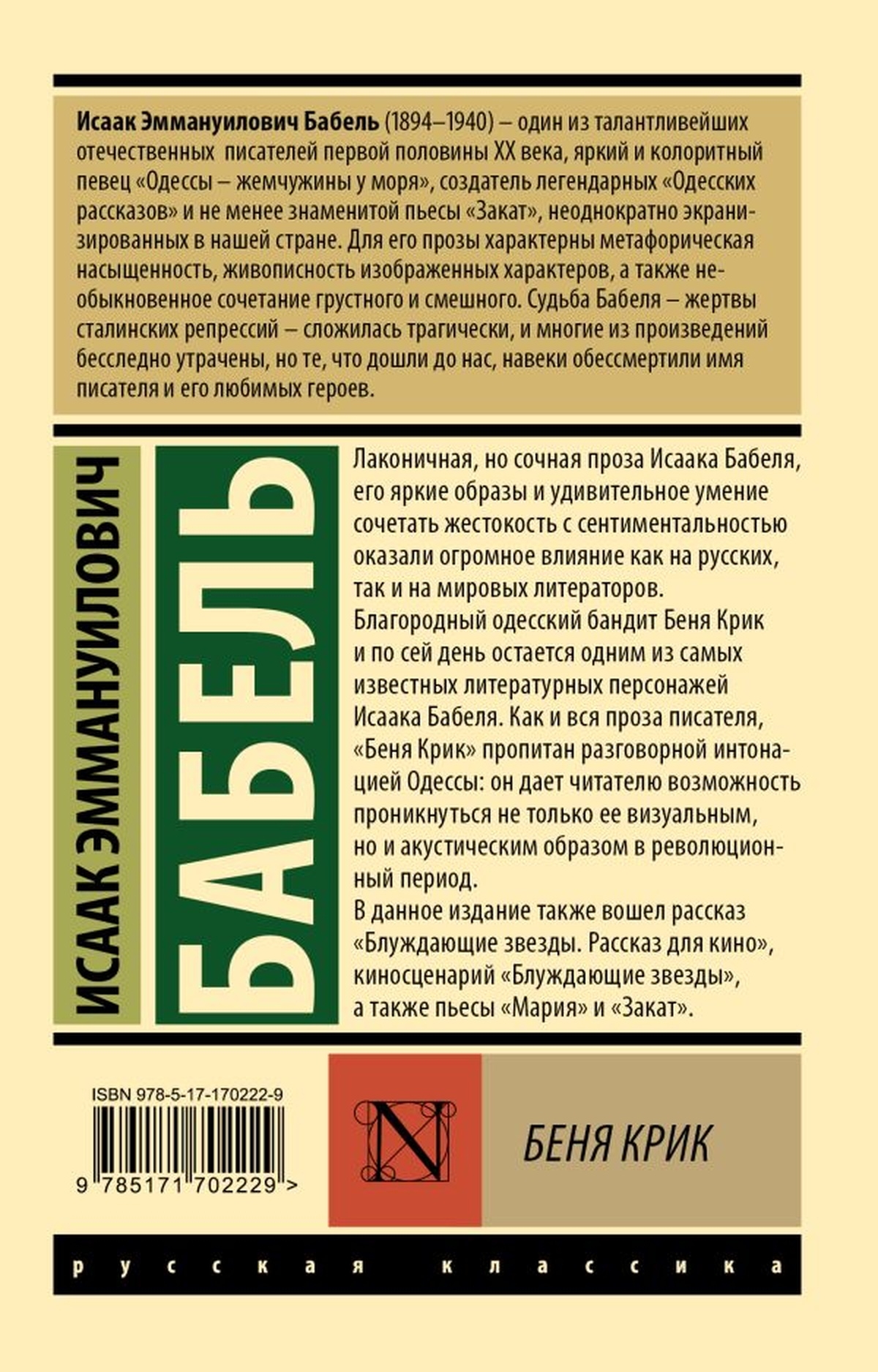 Благородный одесский бандит Беня Крик и по сей день остается одним из самых известных литературных персонажей Исаака Бабеля. Как и вся проза писателя, «Беня Крик» пропитан разговорной интонацией Одессы: он дает читателю возможность проникнуться не только ее визуальным, но и акустическим образом в революционный период.