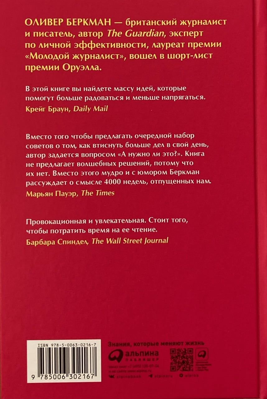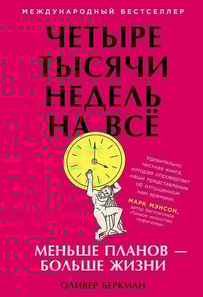 Правда в том, что день, когда вы разгребете рабочую почту, никогда не наступит, а ваш список дел – на самом деле бесконечный конвейер. Оливер Беркман предлагает отложить его в сторону и задать себе вопрос: вы правда хотите тратить отпущенные 4000 недель жизни на безрадостную борьбу за продуктивность? Его книга – мировой бестселлер, который меняет наше представление о времени нашей жизни и о том, как его потратить наилучшим образом. Прочитав ее, вы сможете принять реальность такой, какая она есть, поймете, на что хотите тратить время, а заодно избавитесь от одержимости постоянной занятостью и страха упущенной выгоды.