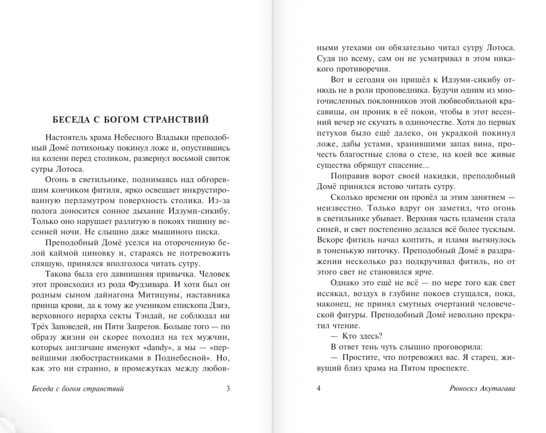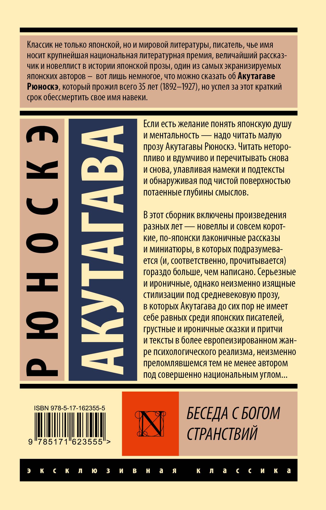 Если есть желание понять японскую душу и ментальность — надо читать малую прозу Акутагавы Рюноскэ. Читать неторопливо и вдумчиво и перечитывать снова и снова, улавливая намеки и подтексты и обнаруживая под чистой поверхностью потаенные глубины смыслов. В этот сборник включены произведения разных лет — новеллы и совсем короткие, по-японски лаконичные рассказы и миниатюры, в которых подразумевается (и, соответственно, прочитывается) гораздо больше, чем написано. Серьезные и ироничные, однако неизменно изящные стилизации под средневековую прозу, в которых Акутагава до сих пор не имеет себе равных среди японских писателей, грустные и ироничные сказки и притчи и тексты в более европеизированном жанре психологического реализма, неизменно преломлявшемся тем не менее автором под совершенно национальным углом...
