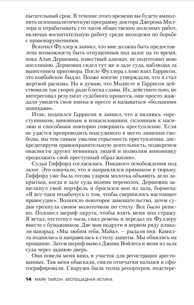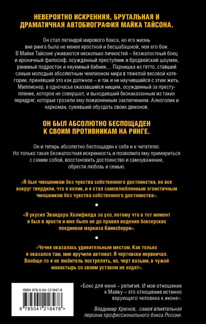 Невероятно искренняя, брутальная и драматичная автобиография Майка Тайсона. Он стал легендой мирового бокса, но его жизнь вне ринга была не менее яростной и бесшабашной, чем его бои. В Майке Тайсоне уживаются несколько личностей — безжалостный боец и ироничный философ, осужденный преступник и бродвейский шоумен, ранимый подросток и неуемный бабник… Парнишка из гетто, ставший самым молодым абсолютным чемпионом мира в тяжелой весовой категории, принявший это как должное — и так и не научившийся с этим жить. Миллионер, в одночасье оказавшийся нищим, осужденный за преступление, которое не совершал, и выходивший безнаказанным из таких передряг, которые грозили ему пожизненным заключением. Алкоголик и наркоман, сумевший обуздать своих демонов. Он был абсолютно беспощаден к своим противникам на ринге. Он и теперь абсолютно беспощаден к себе и к читателю. Но только такая безжалостная искренность и позволила ему примириться с самим собой, восстановить достоинство и самоуважение, обрести любовь и семью.