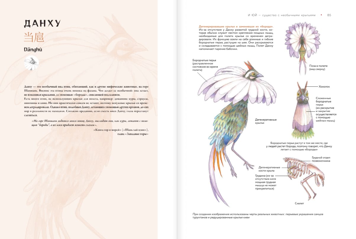 Откройте этот артбук — и древние существа оживут на ваших глазах. Здесь собраны иллюстрации, описания и биологическое особенности 40 мифических существ из древнекитайского трактата «Книга гор и морей». Каждое существо сопровождает яркая иллюстрация, древние предания, цитаты из «Книги гор и морей», описание внешнего и внутреннего строения создания. Вы встретите Инлуна, способного призывать дожди, Чжулуна, влияющего на времена суток и года, птицу Лэй с двумя головами, управляющую огнем, безликого светящегося Дихуна, рыбу с куриными лапками Цзоу Юй и многих других удивительных созданий.