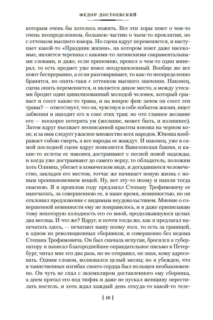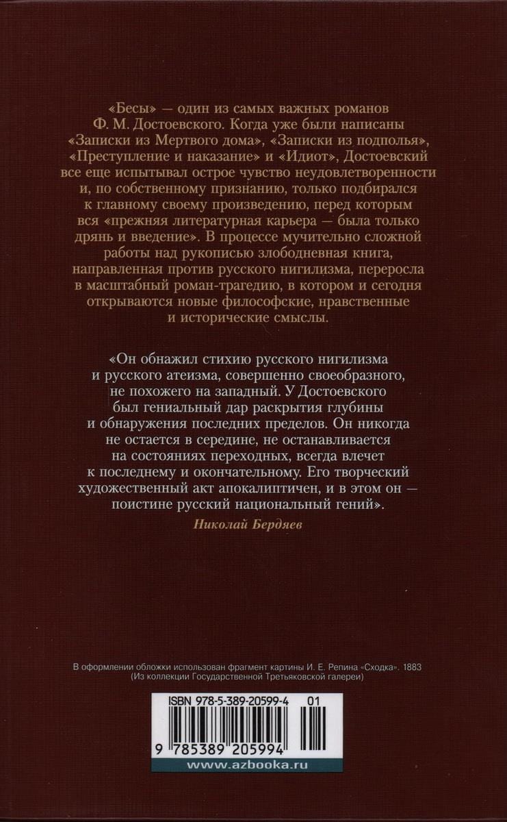 «Бесы» — один из самых важных романов Ф. М. Достоевского. Когда уже написаны были «Записки из Мертвого дома», «Записки из подполья», «Преступление и наказание» и «Идиот», Достоевский все еще испытывал острое чувство неудовлетворенности и, по собственному признанию, только подбирался к главному своему произведению, перед которым вся «прежняя литературная карьера — была только дрянь и введение». В процессе мучительно сложной работы над рукописью, злободневная книга, направленная против русского нигилизма, переросла в масштабный роман-трагедию, в котором и сегодня открываются новые философские, нравственные и исторические смыслы.