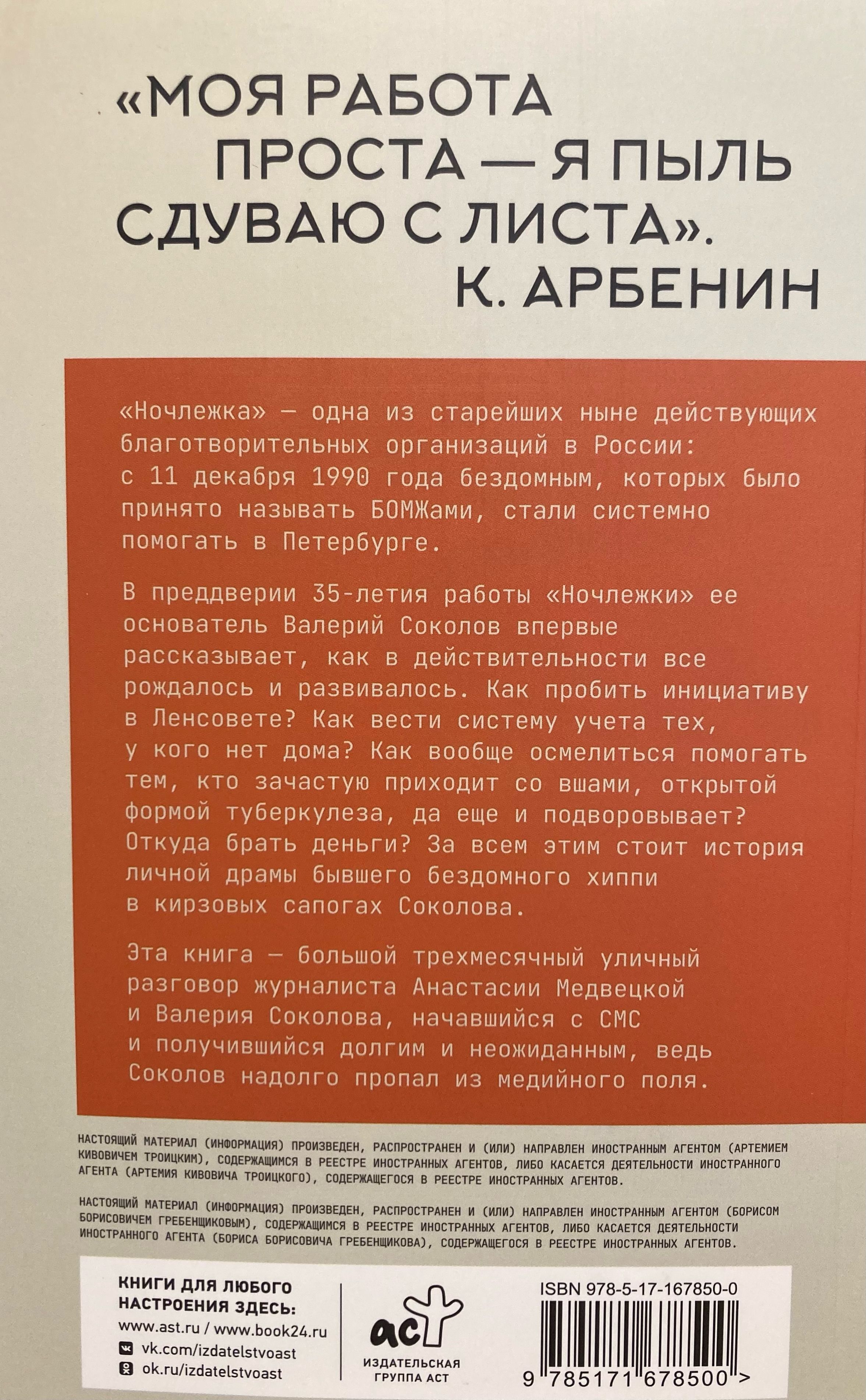 Эта книга – большой трехмесячный уличный разговор журналиста Анастасии Медвецкой и основателя «Ночлежки» Валерия Соколова. Соколов впервые рассказывает, как в действительности все рождалось и развивалось. Как пробить инициативу в Ленсовете? Как вести систему учета тех, у кого нет дома? Как вообще осмелиться помогать тем, кто зачастую приходит со вшами, открытой формой туберкулеза, да еще и подворовывает? Откуда брать деньги? За всем этим стоит история личной драмы бывшего бездомного хиппи в кирзовых сапогах Соколова.