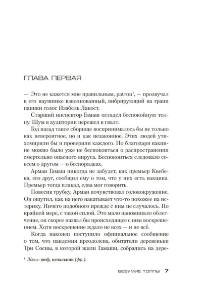 Луиза Пенни, знаменитый автор детективов о старшем инспекторе Армане Гамаше, в новом романе поднимает жесткие и оттого неудобные вопросы. Что утратило и что приобрело цивилизованное общество после пандемии двадцать первого столетия, которая невольно заставила нас вспомнить о мрачных коллизиях Средневековья? Неужели напуганная, сбитая с толку толпа готова пойти за новым лидером, который провозглашает: «Все будет хорошо»? Хорошо, но не для всех... Эпидемия схлынула. Накануне Нового года в Квебек по приглашению почетного ректора университета приезжает лектор, профессор Эбигейл Робинсон. Тема ее выступления вызывает небывалый ажиотаж, и ректор лично просит старшего инспектора полиции Гамаша обеспечить порядок в зале. Симпатичная Робинсон прекрасно владеет вниманием аудитории, несмотря на острые разногласия среди слушателей. И вдруг звучат выстрелы... Поднимается паника. К счастью, Эбигейл даже не ранена, но Гамашу приходится принять все необходимые меры для ее дальнейшей защиты, хотя... позиция профессора вызывает у него (и не только) крайнее отторжение. Присутствие этой женщины сеет раздор даже в таком тихом месте, как деревня Три Сосны. И несмотря на все усилия полицейских Квебека, в новогоднюю ночь, под гром фейерверка, в считаных шагах от праздничной кутерьмы происходит жестокое убийство... В ходе расследования Гамаш интуитивно хватается за маловероятную версию, и эта нить уводит его в прошлое, к страшному преступлению против человечности, совершенному здесь, в цивилизованной стране...