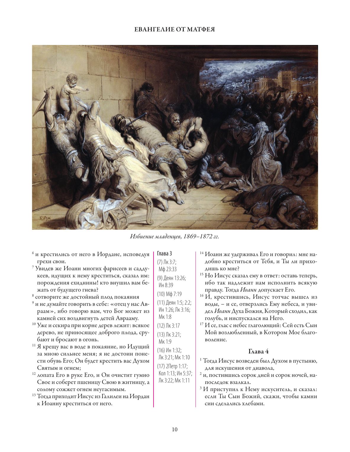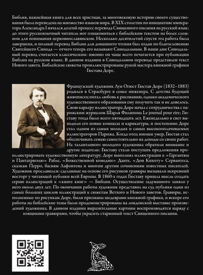 Библия, важнейшая книга для всех христиан, за многовековую историю своего существования была переведена на множество языков мира. В XIX столетии по инициативе императора Александра I начался долгий процесс перевода Священного писания на русский язык; до этого русскоязычный читатель мог ознакомиться с библейским текстом на более сложном для понимания церковнославянском. Несколько десятилетий спустя эта работа была завершена, и полный перевод Библии для домашнего чтения был издан по благословению Святейшего Синода — отчего теперь его называют Синодальным. В наши дни Синодальный перевод считается классическим: именно он чаще всего печатается при публикации Библии на русском языке. В данном издании в Синодальном переводе представлен текст Нового завета. Библейские сюжеты проиллюстрированы рукой мастера книжной графики Гюстава Доре.