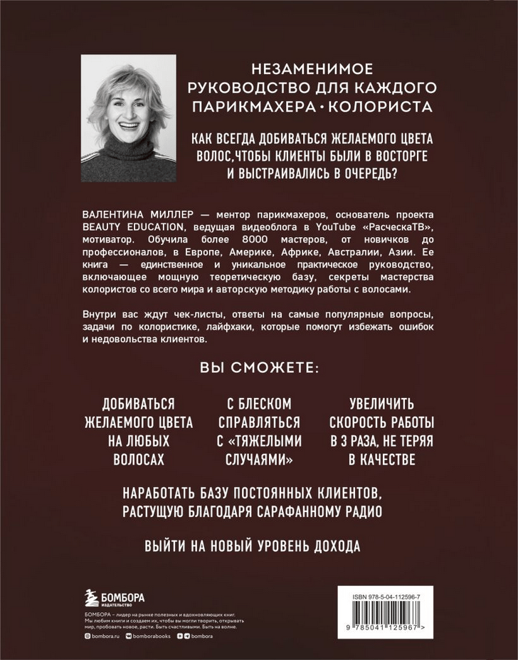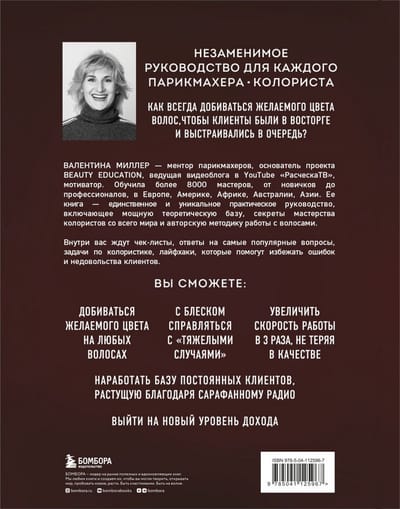 Валентина Миллер — эксперт по колористике международного уровня, обучила более 5 000 мастеров. В ее книге вас ждет мощная теоретическая база, секреты колористов со всего мира, авторская методика работы с волосами, а также тонкости и лайфхаки, проверенные 16-тилетним опытом. Не важно, новичок вы или гуру, «Библия парикмахера колориста» выведет вас на совершенно другой уровень.