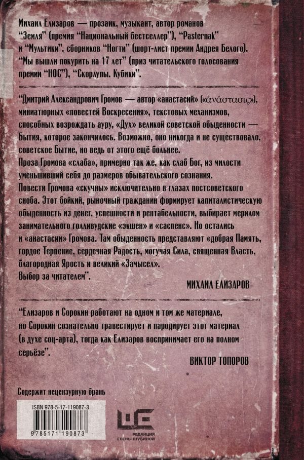 Михаил Елизаров — автор романов "Земля", "Pasternak" и "Мультики" (шорт-лист премии "Национальный бестселлер"), сборников рассказов "Ногти" (шорт-лист премии Андрея Белого), "Мы вышли покурить на 17 лет" (приз читательского голосования премии "НОС").