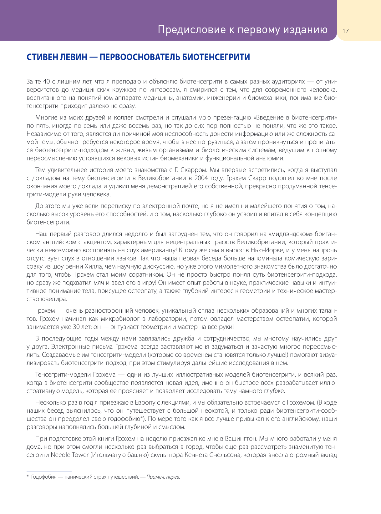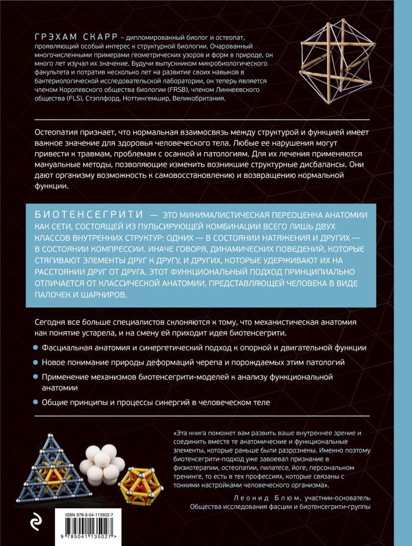 В своей книге Т. Майерс, конечно же, упоминает и объясняет понятие тенсегрити, ссылаясь на Р.Б. Фуллера, но делает это очень кратко и без дальнейшего развития. Книга Г. Скарра — это следующая ступень для тех, кто убедился на практике в применимости и пользе тех конкретных частных синергий, о которых говорит Т. Майерс, и теперь мотивирован к тому, чтобы пойти дальше и начать понимать не только частные примеры, но и самые общие принципы и процессы синергий в нашем теле.