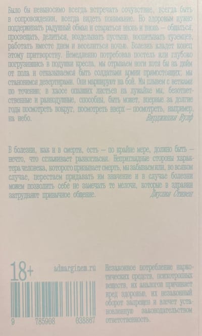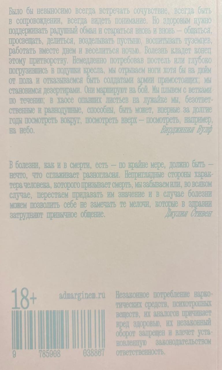 В эссе «Быть больным» (1926) Вирджиния Вулф затрагивает вопрос: почему болезням — повседневному и неотъемлемому явлению человеческой жизни — посвящено непростительно мало текстов? По мнению писательницы, которая сама немало страдала от телесных недугов, вынужденно оторванному от привычного мира и прикованному к кровати человеку открывается совершенно иное видение вещей. Для Вулф болезнь — это трамплин, позволяющий вырваться за пределы расхожих истин, «радушного обмана» общества и начать воспринимать мир вне норм, как бы изнутри себя. В своем взгляде на болезнь она расходится с матерью Джулией Стивен, опытной сиделкой и автором практического руководства «Записки из комнат больных» (1883). Оба текста впервые публикуются на русском языке и знакомят читателя с двумя разными способами письма о болезни от двух непохожих друг на друга женщин.