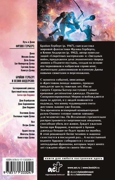 Тем временем всемирный компьютерный разум Омниус готовит новую ловушку для человечества. По Вселенной стремительно распространяется смертоносная эпидемия, способная убить все живое. Грядет ужасная Битва при Коррине, в которой у Армии джихада больше не будет права на ошибку. В этой решающей битве человек и машина схлестнутся в последний раз… А на пустынной планете Арракис собираются с силами легендарные фримены, которым через много лет суждено обрести своего Мессию.