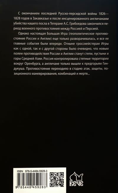 Однако настоящая Большая Игра (геополитическое противостояние России и Англии) еще только разворачивалась, и все ее главные события были впереди. Отныне гроссмейстерам Игры как с одной, так и с другой стороны было очевидно, что новым полем противодействия России и Англии станут степи, пустыни и горы Средней Азии. Россия контролировала степи вокруг Оренбурга, а англичане только вышли к предгорьям Гиндукуша. Противостояние переходило в стадию атак, защиты, позиционного маневрирования, комбинаций и жертв...