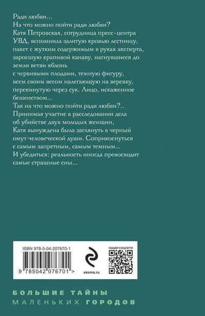 Катя Петровская, сотрудница Пресс-центра УВД, вспомнила залитую кровью лестницу, пакет с его жутким содержимым в руках эксперта, заросшую крапивой канаву, нагнувшиеся до земли ветви яблонь с червивыми плодами, темную фигуру, всем своим весом налегающую на веревку, перекинутую через сук. Лицо, искаженное бешенством…