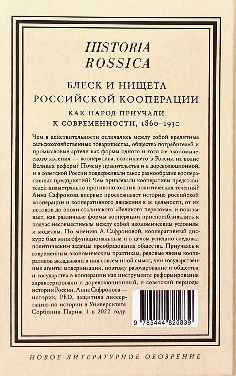 Чем в действительности отличались между собой кредитные сельскохозяйственные товарищества, общества потребителей и промысловые артели как формы одного и того же экономического явления — кооператива, возникшего в России на волне Великих реформ? Почему правительства и в дореволюционной, и в советской России поддерживали такое разнообразие кооперативных предприятий? Чем привлекали кооперативы представителей диаметрально противоположных политических течений? Анна Сафронова впервые прослеживает историю российской кооперации и кооперативного движения в ее цельности, от их истоков до эпохи сталинского «Великого перелома», и показывает, как различные формы кооперации приспосабливались к подчас несовместимым между собой экономическим условиям и моделям. По мнению А. Сафроновой, кооперативный дискурс был многофункциональным и в целом успешно следовал политическим задачам преобразования общества. Приучаясь к современным экономическим практикам, рядовые члены кооперативов вкладывали в них совсем иной смысл, чем государственные агенты модернизации, поэтому разочарование и общества, и государства в кооперации как инструменте реформирования характеризовало и дореволюционный, и советский периоды истории России.